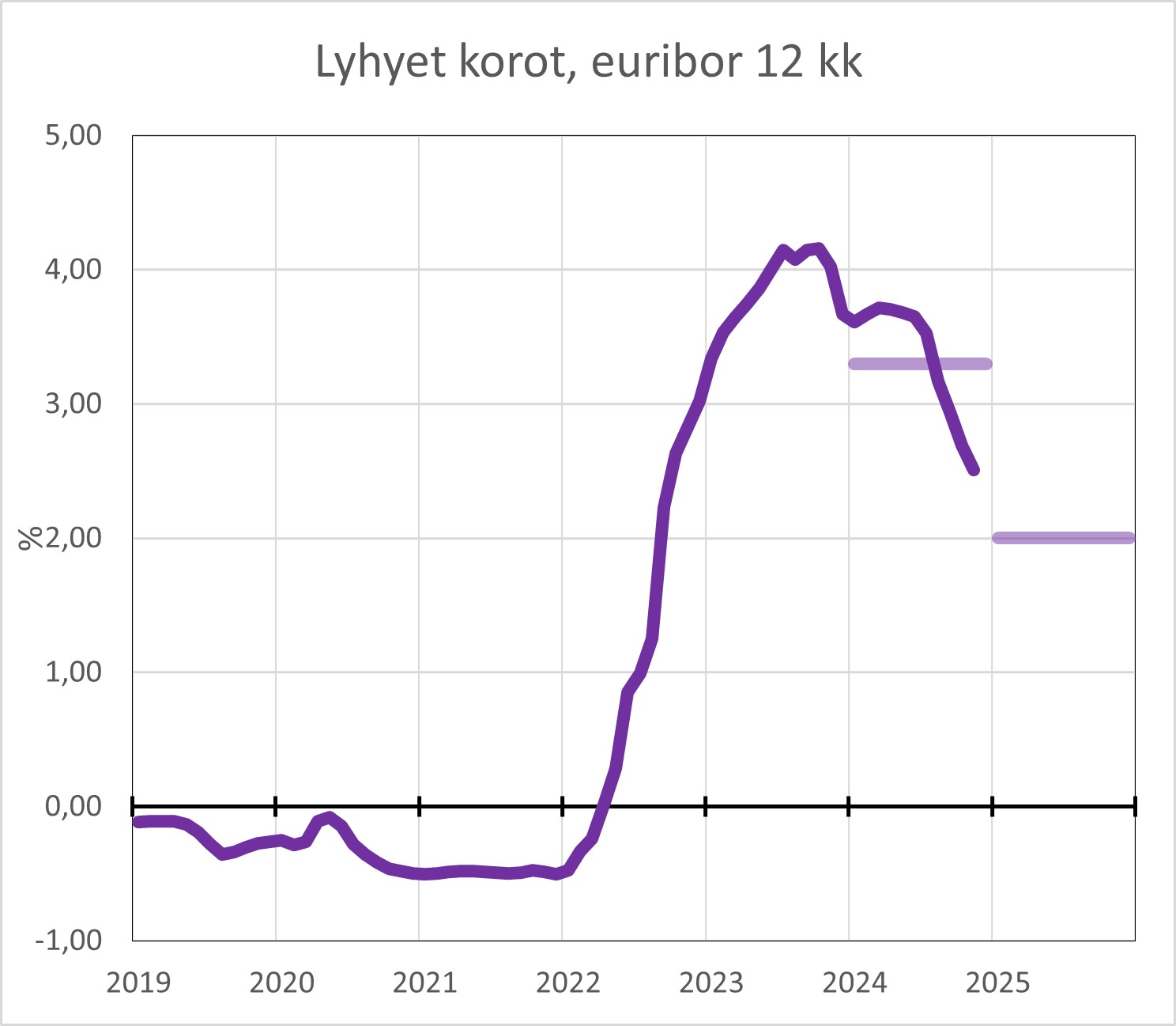 - Kuluvana vuonna 12 kuukauden Euriborin keskiarvon arvioidaan olevan noin 3,3 prosenttia, kun taas ensi vuodelle odotetaan keskimäärin 2 prosentin tasoa.