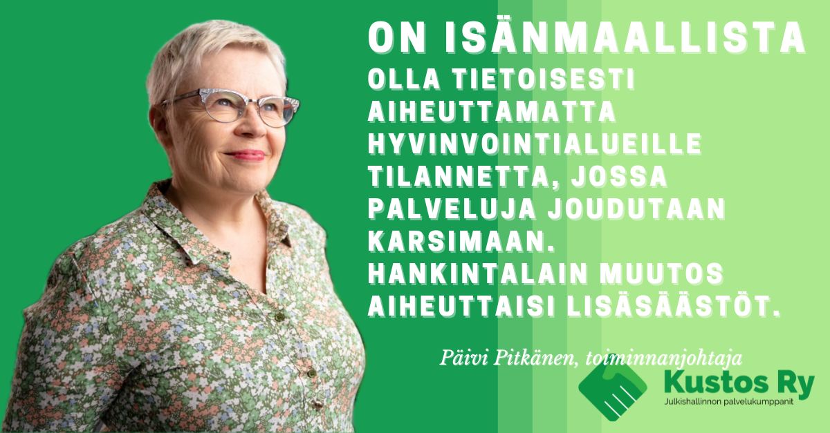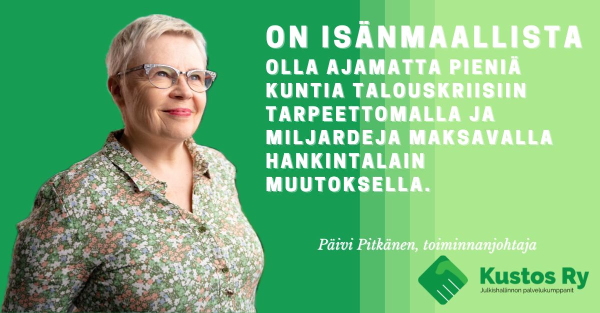 ”Kunnille paikallisten yrittäjien menestyminen on erittäin tärkeää. Pelkona on, että uudistuksessa ajaudutaan ojasta allikkoon esimerkiksi siten, että kunnat palaisivat omaan tuotantoon tai kotimaisten ja paikallisten yritysten sijaan markkinat valuisivat kansainvälisille suuryhtiöille”, Nurmijärven kunnanjohtaja Outi Mäkelä korostaa Kuntaliiton ja kuntien yhteisessä tiedotteessa.