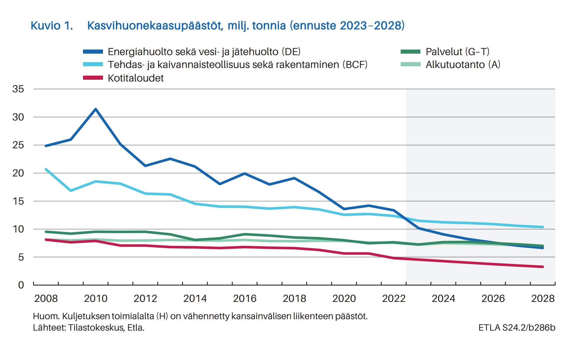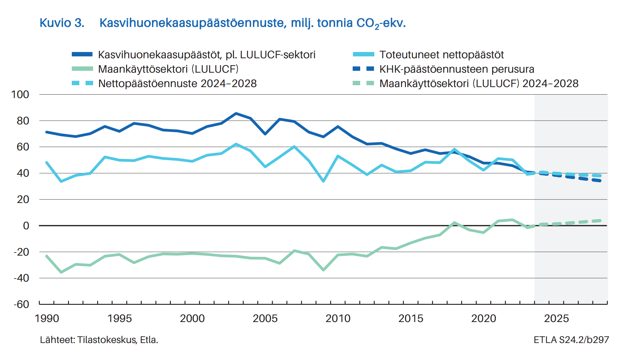 Elinkeinoelämän tutkimuslaitoksen tänään julkaiseman päästöennusteen (Etla Erikoisartikkeli 11) mukaan Suomen kasvihuonekaasupäästöjen (CO2-ekvivalentin määrän) odotetaan vuoteen 2028 mennessä laskevan keskimäärin noin 3,4 prosenttia vuodessa, poislukien maankäyttösektori. Tahti on hieman aiempaa hitaampaa.