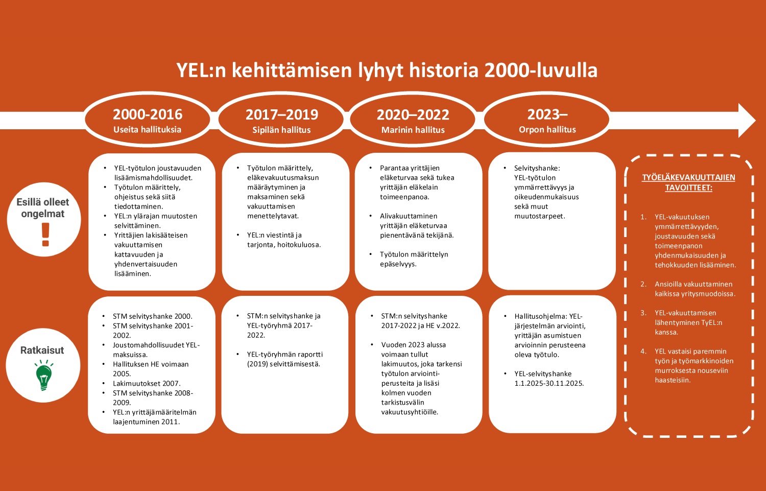 Työeläkealan näkökulmasta selvityshankkeessa keskeistä tulee olla yrittäjien riittävän työeläketurvan varmistaminen yrittäjyyden muuttuessa sekä YEL:n kattavuudesta ja yrittäjän vakuuttamisvelvollisuudesta huolehtiminen.
