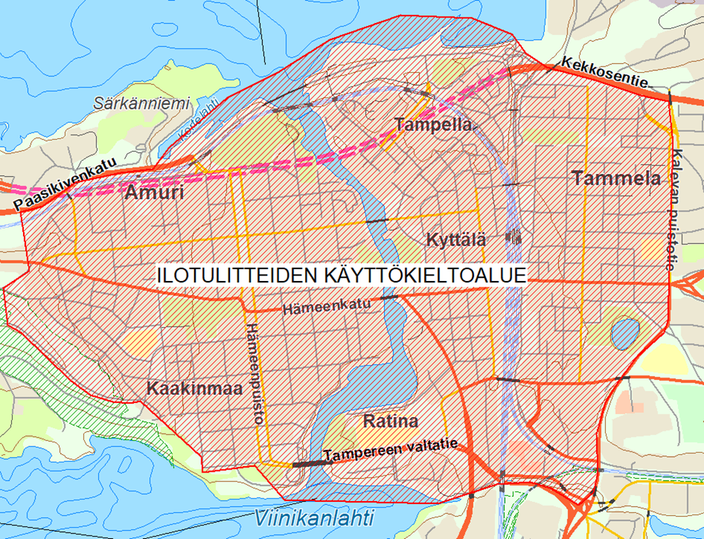 Ilotulitteiden käyttö on yleisesti sallittua ilman pelastusviranomaiselle tehtävää ilmoitusta 31.12.2024 klo 18:00–1.1.2025 klo 02:00 välisenä aikana. Poikkeuksen tästä muodostaa Tampereen ydinkeskustan alue, jossa yksityishenkilöiden ilotulitteiden käyttöä on rajoitettu lain perusteella yleisen turvallisuuden takaamiseksi (ks. kartta liitteenä).