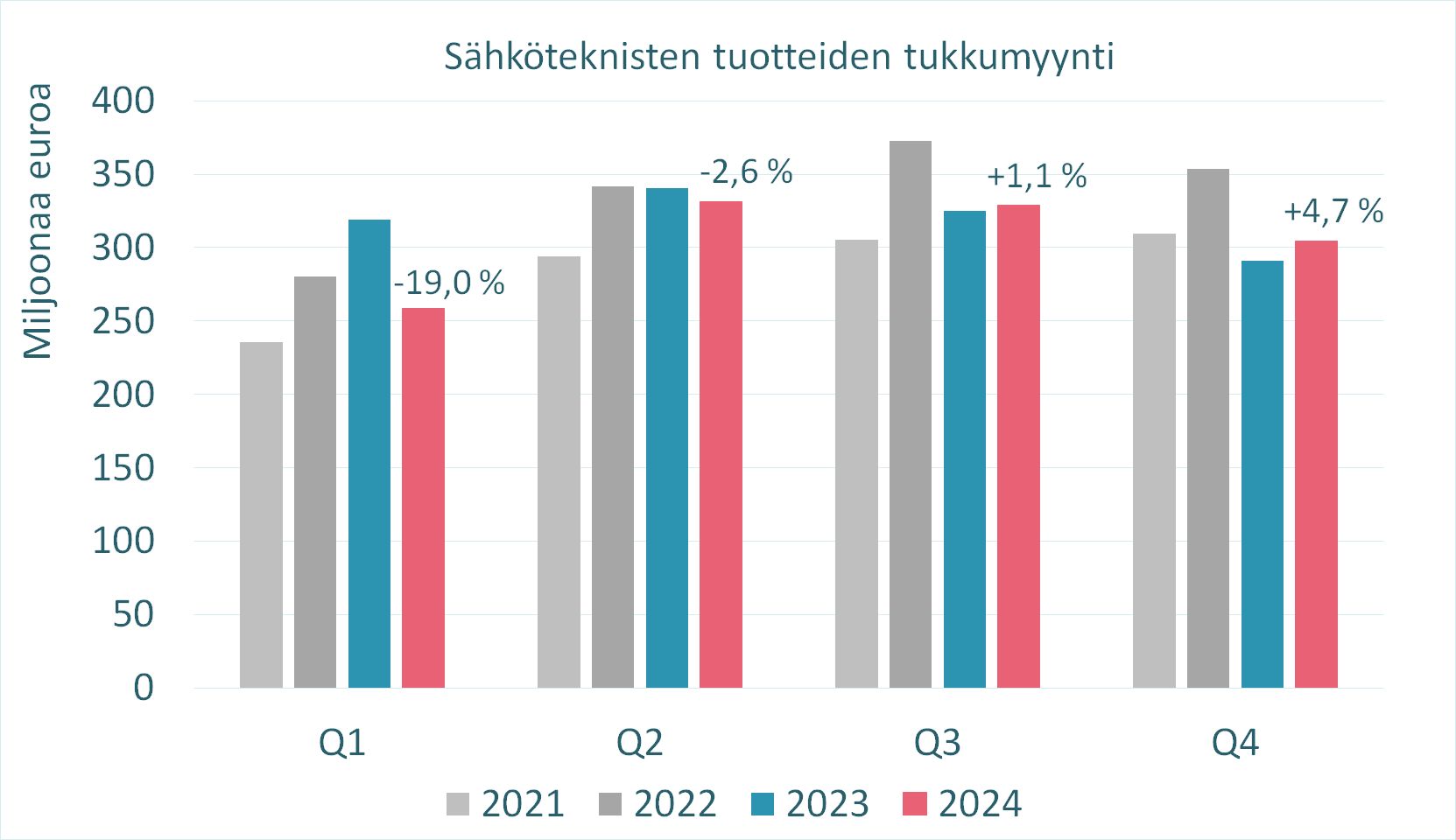 Alkuvuoden vaisusti käynyt kauppa piti kuitenkin koko vuoden 2024 tukkumyynnin miinuksella 4,1 prosenttia edellisvuoteen verrattuna. Vuoden 2024 yhteenlaskettu tukkumyynnin arvo oli 1,223 miljardia euroa. Se on kautta aikain kolmanneksi suurin vuosimyynti Sähköteknisen kaupan liitto ry:n tilastoissa.