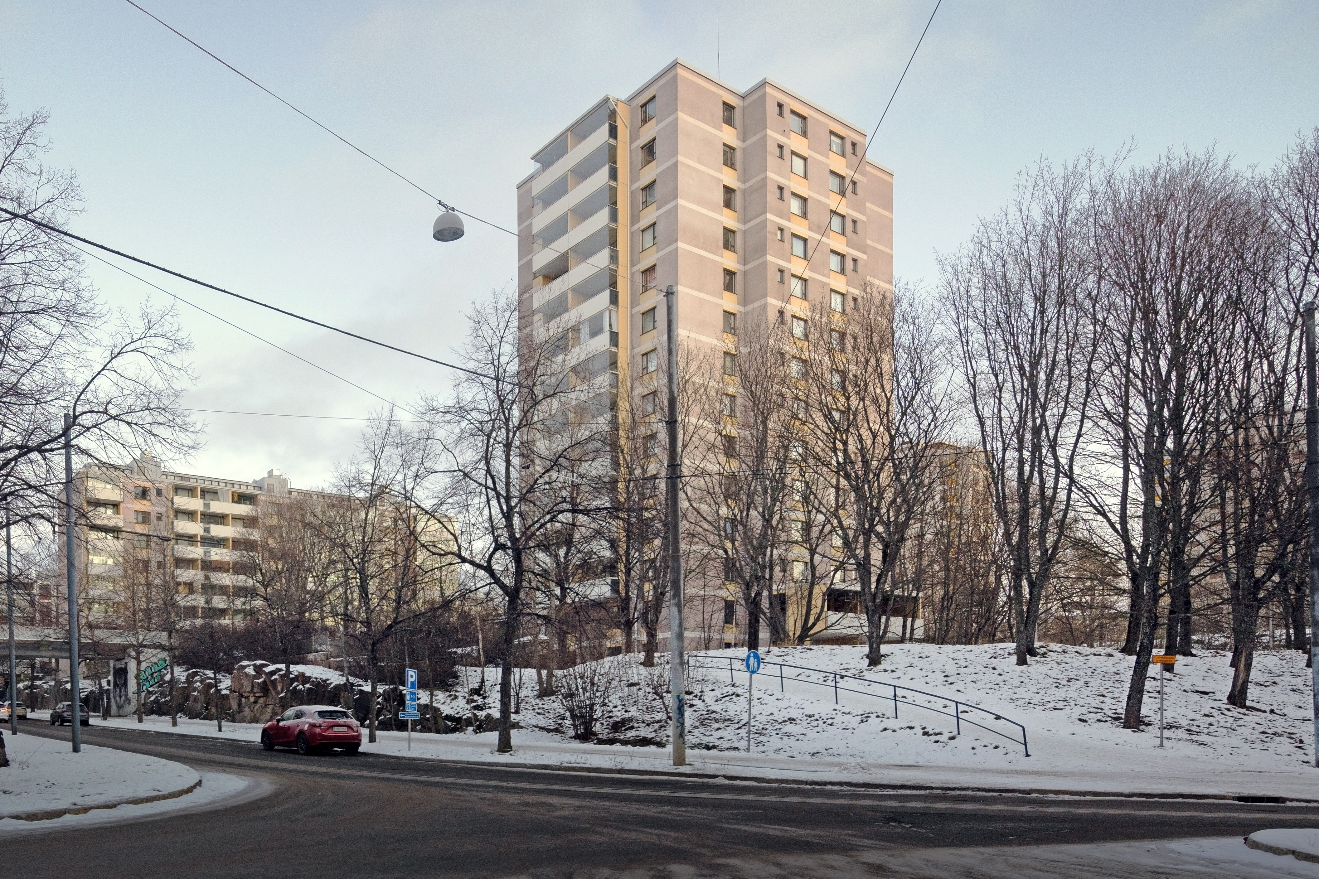 Näkyvällä paikalla sijaitseva 13-kerroksinen Vislauskuja 5 on yksi Itä-Pasilan korkeimmista rakennuksista. Aivan Vallilan rajan tuntumassa sijaitsevaan taloyhtiöön kuuluu myös matalampi lamellitalo.