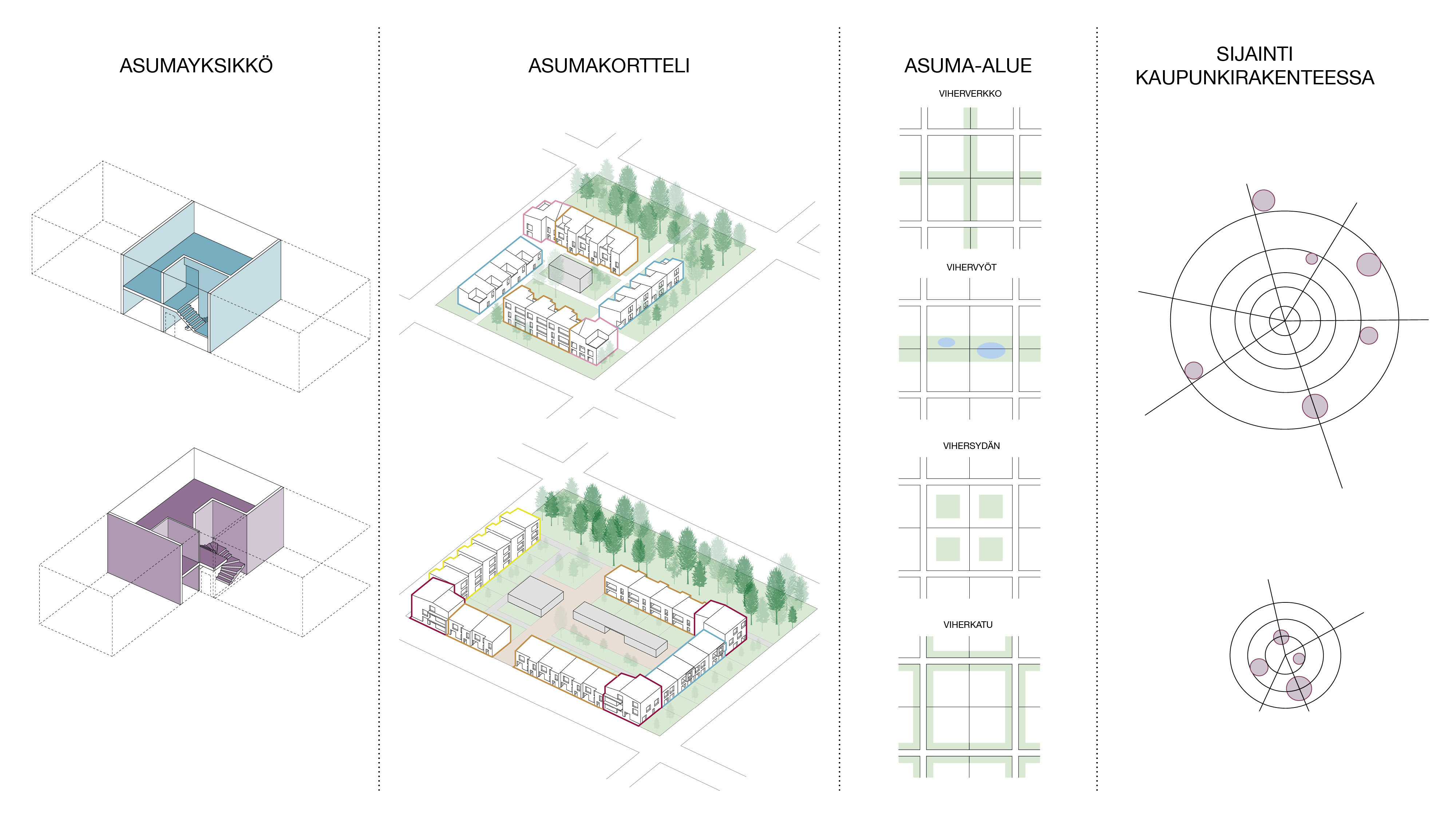 Asumayksiköiden kytkeytyvyys ja monikerroksisuus tuottavat maankäyttöön tehokkuutta ja kaupunkimaista miljöötä. Riittävyys ja sopivuus tarjoavat sopivan kokoiset – ei liian pienet mutta ei myöskään turhan suuret – asuintilat erilaisille asuntokunnille ja mahdollistavat tilamäärän muutokset ilman tarvetta muuttaa kokonaan eri asuntoon.