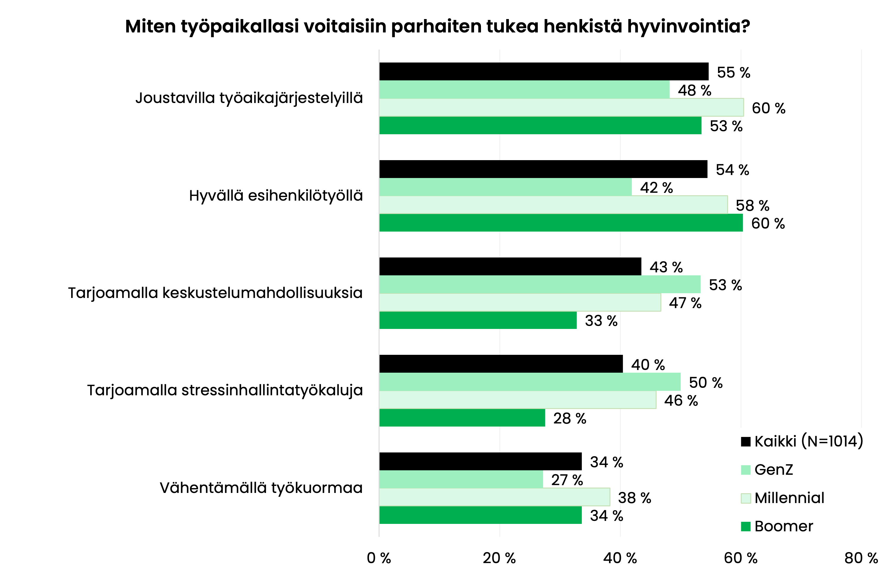 Nuoremmat sukupolvet vaativat selvästi muutosta työelämään: he toivovat vähemmän kuormittavaa työtaakkaa ja oikeita työkaluja stressinhallintaan. Z-sukupolveen kuuluvista vastaajista 60 prosenttia ja millenniaaleista lähes yhtä moni (58 %) piti työkuorman vähentämistä tärkeänä. Stressinhallintatyökaluja arvostaisi Z-sukupolven edustajista yli puolet (53 %) ja lähes yhtä moni (47 %) millenniaaleista.