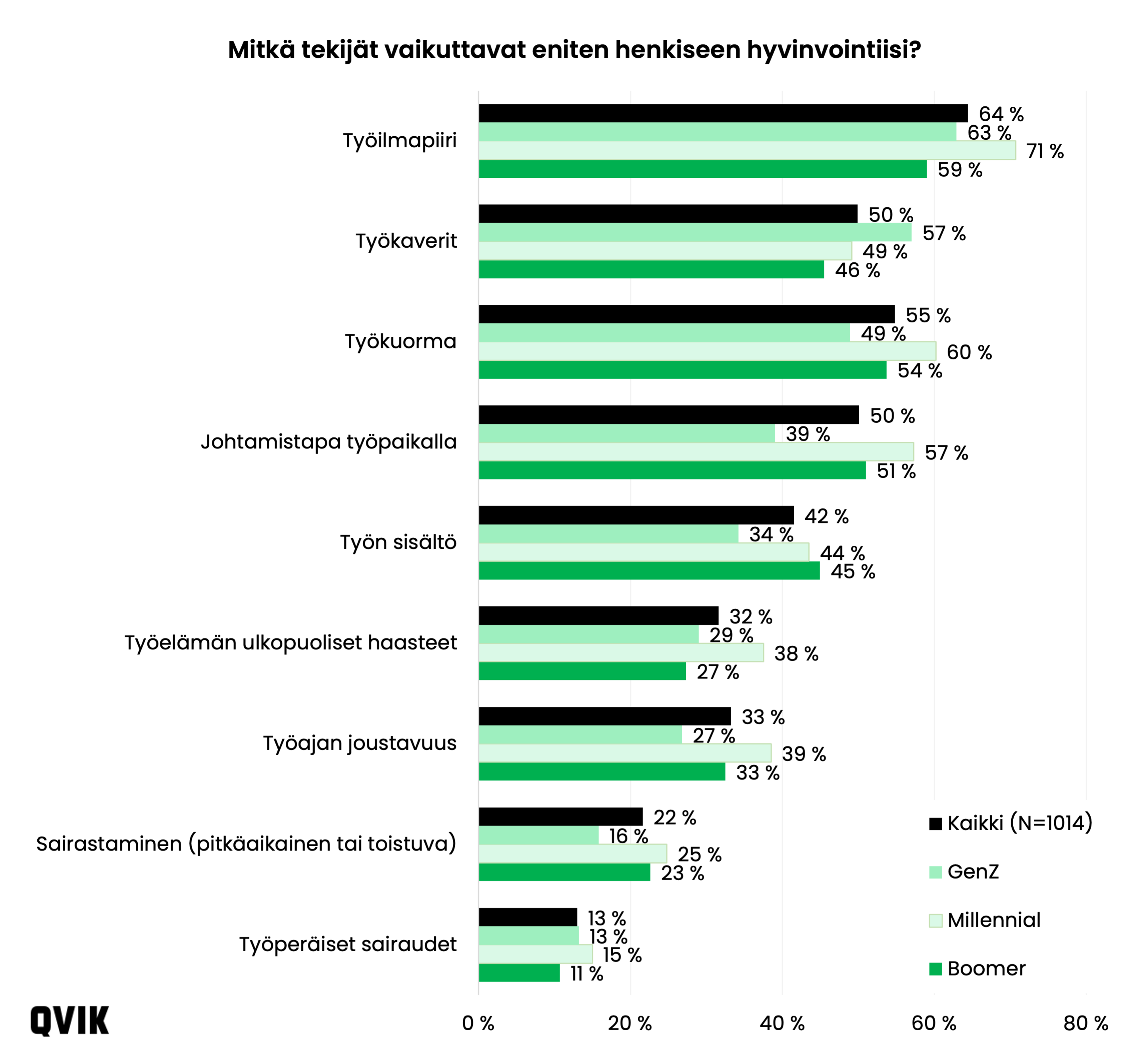 Tutkimuksessa selvitettiin, mitkä tekijät vaikuttavat eniten vastaajien henkiseen hyvinvointiin työpaikalla. Yllättäen työilmapiiri on monille merkittävämpi asia kuin työkuorma. Kaikista vastaajista useampi kuin kuusi kymmenestä (64,3 %) piti työilmapiiriä tärkeimpänä tekijänä, yli puolet (54,5 %) työkuormaa, lähes puolet (49,8 %) johtamistapaa, miltei yhtä moni (49,6 %) työn sisältöä ja neljä kymmenestä (41,5 %) työkavereita.