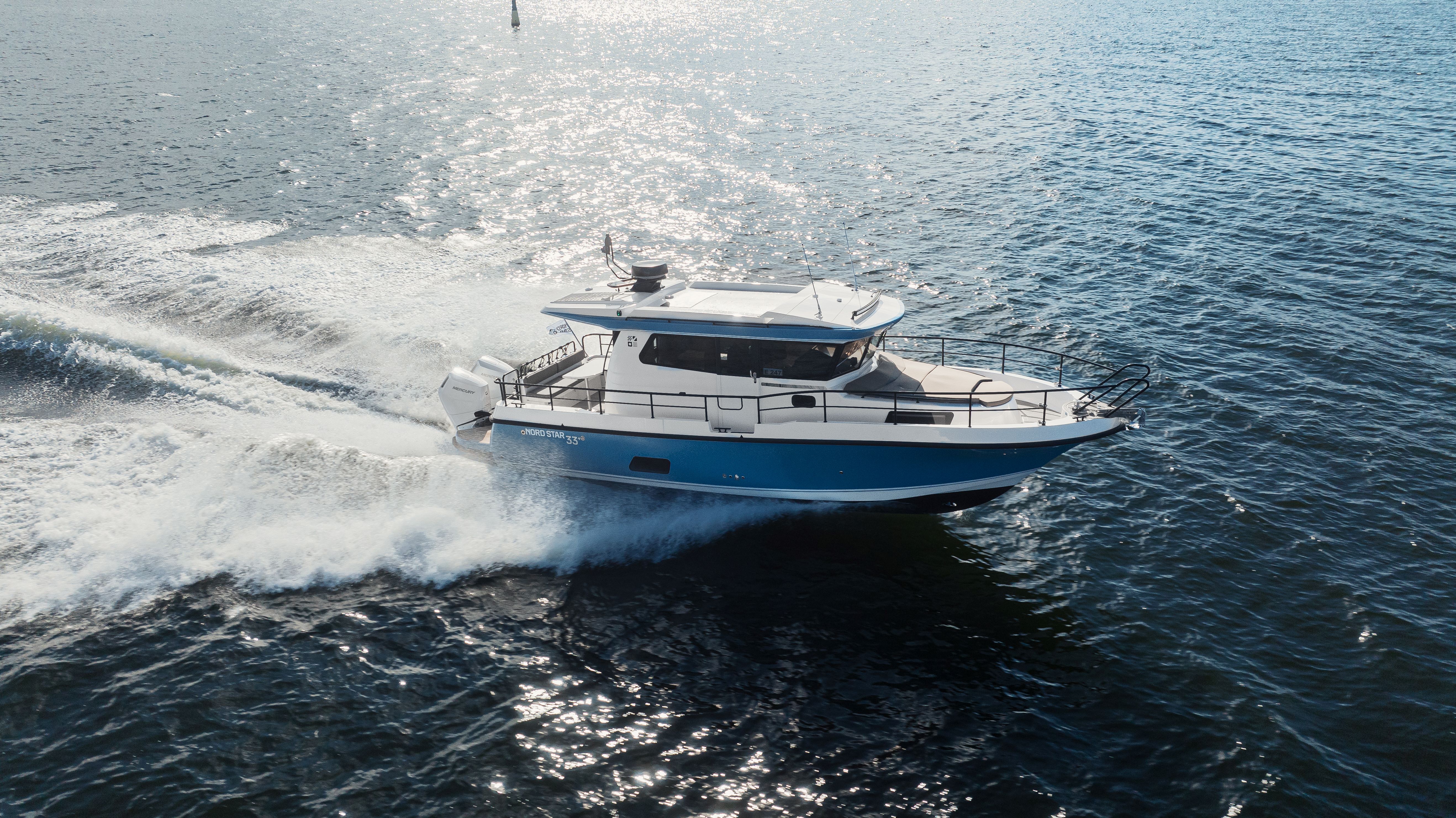 Nord Star 33 + offers superior living comfort in its class. Walk-around access with three doors guarantee safe and easy passage on deck. A luxurious salon offers extra comfort for excursions. Galley can be placed either up in the saloon or down in the front. The cabins are designed for a mature taste: in front it has a bed for two, the centre cabin offers sleeping space for up to three persons. A large toilet and shower are placed in the front.
