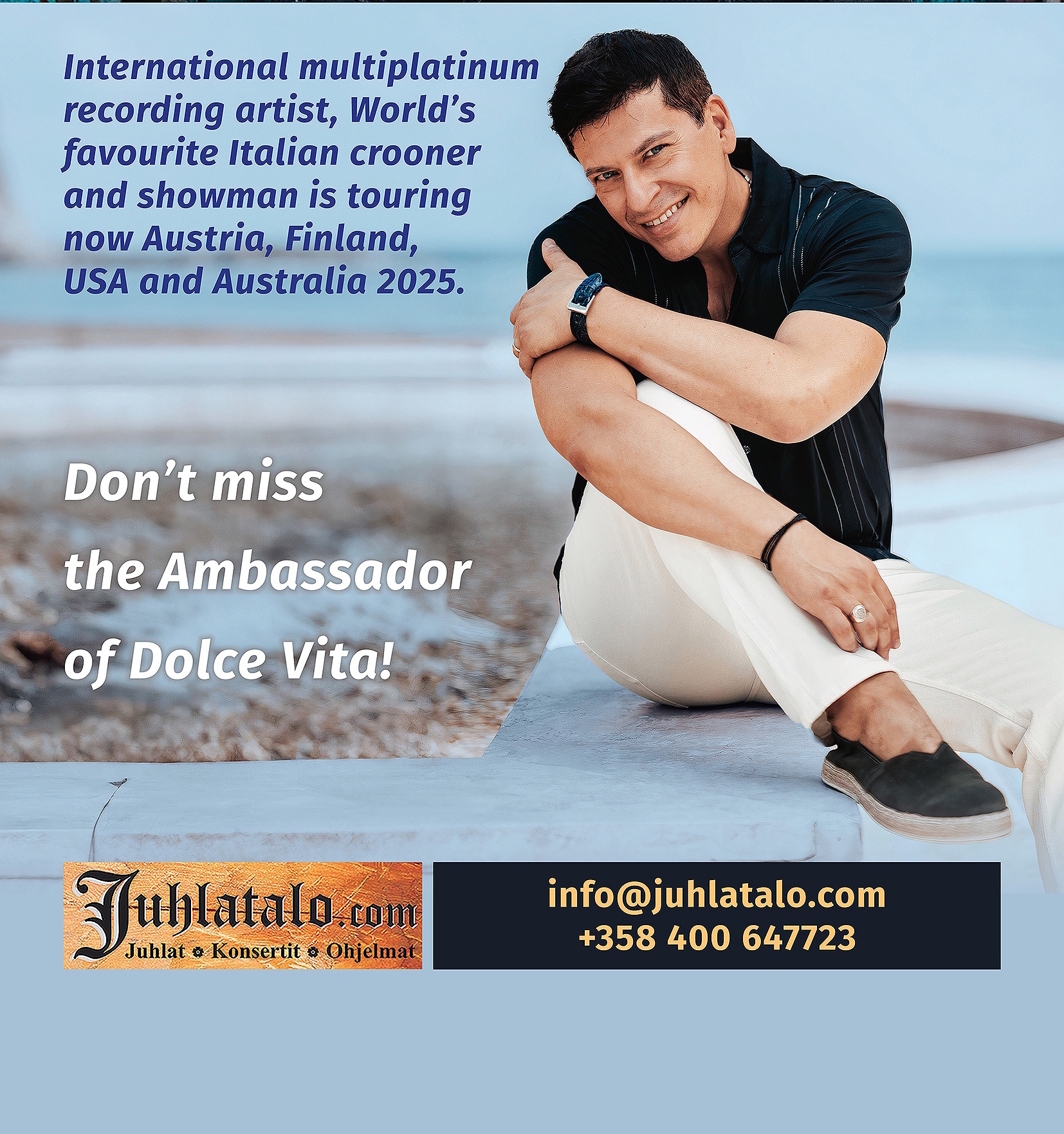 The concerts in February at Helsinki's Kulttuuritalo, Turku's Concert Hall, and Jyväskylä's Pavilion will also pay tribute to artists who brought the world music and Italian music boom to Finland, such as Kari Tapio, Umberto Marcato, Henry Theel, Paula Koivuniemi, and Fredi. For instance, songs like L`italiano, Gli occhi miei (Help yourself), Smile, O Sole Mio, Ciao ciao bambina, You’re My World, Il Mondo, Parla Piu Piano, Surrender, Amigos Para Siempre, Americano, and Come Prima will lift the mood through Patrizio's modern interpretation.
