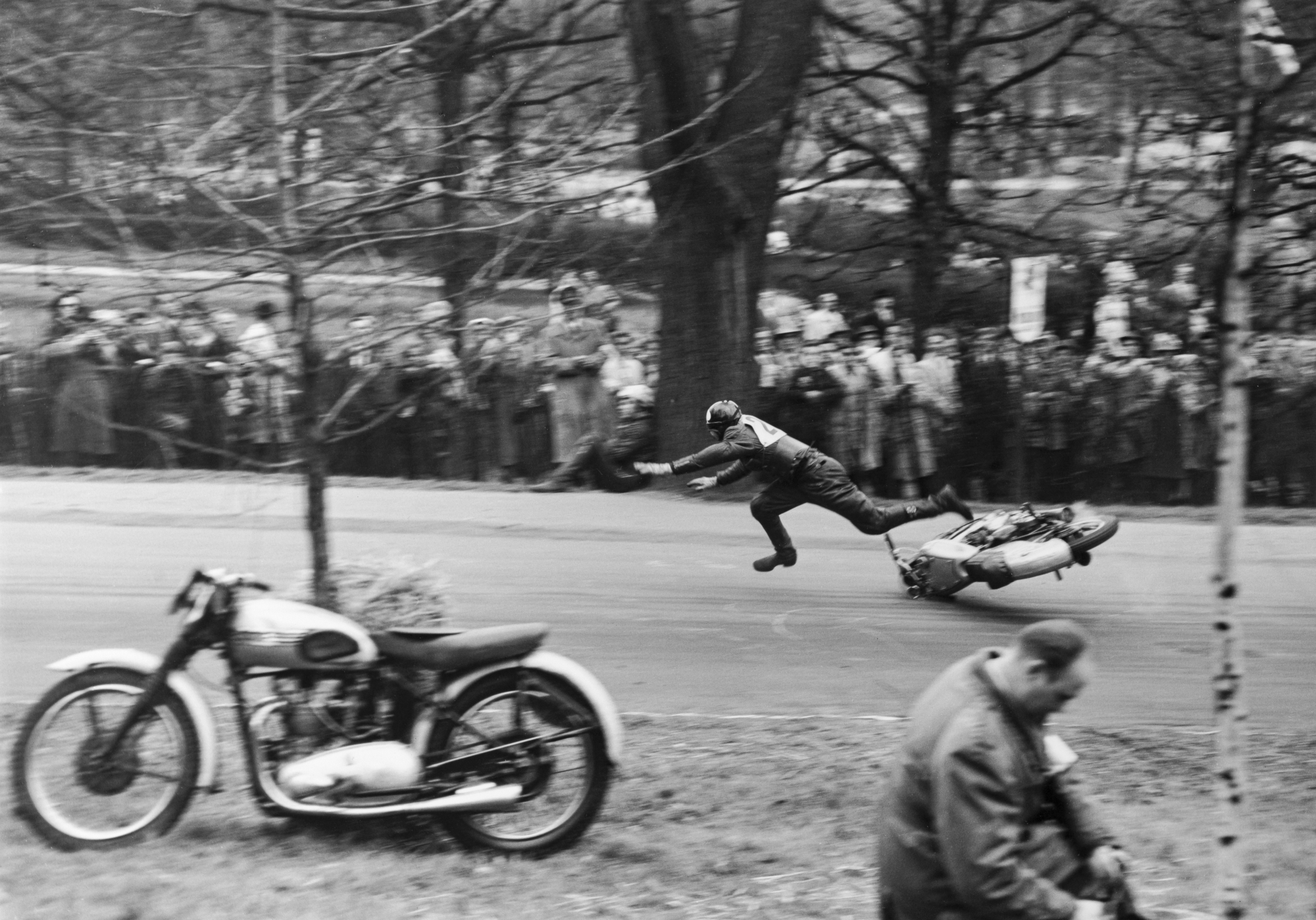 Kilpamoottoripyöräilijä Pentti Lehtelä kaatuu radalla Helsingissä vuonna 1954, taustalla katsojia.