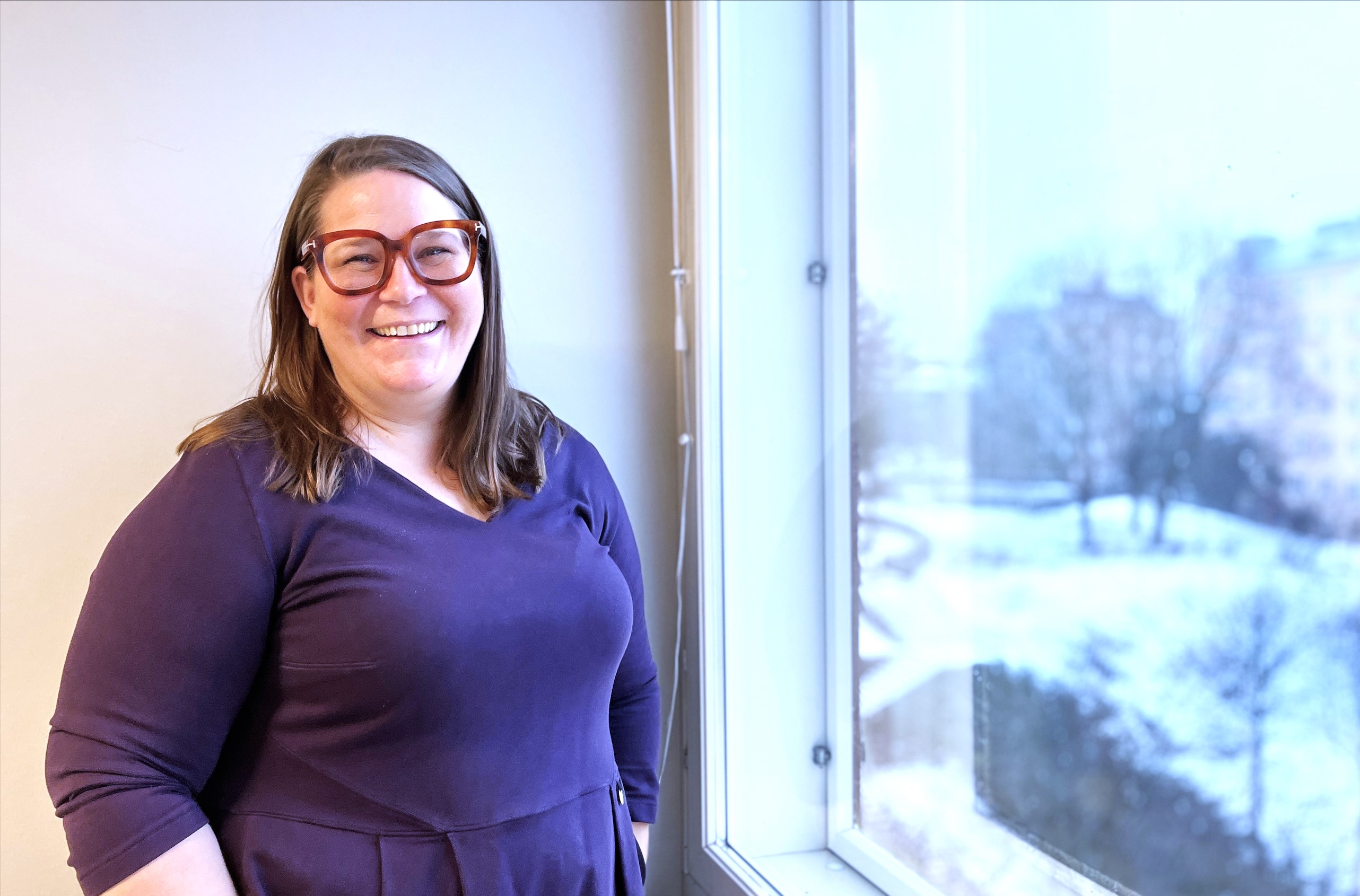 Reilu kauppa ry:n hallituksen puheenjohtaja Maria Sangder seisoo hymyilevänä ikkunan ääressä.