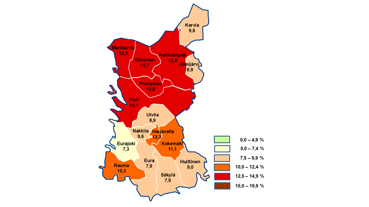 Joulukuussa työttömyys oli korkeinta Porissa, jossa työttömien työnhakijoiden osuus työvoimasta oli 14,1 %. Alin työttömyys oli Eurajoella (7,3 %).