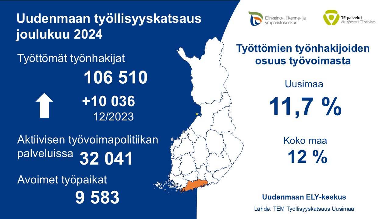 Ilman työsuhdetta olevien määrä nousi yhä joulukuussa. Samalla työttömien yhteismäärä nousi Uudellamaalla 10,4 % edellisvuoteen verrattuna. Työttömiin lasketaan ilman työsuhdetta olevat ja lomautetut henkilöt.