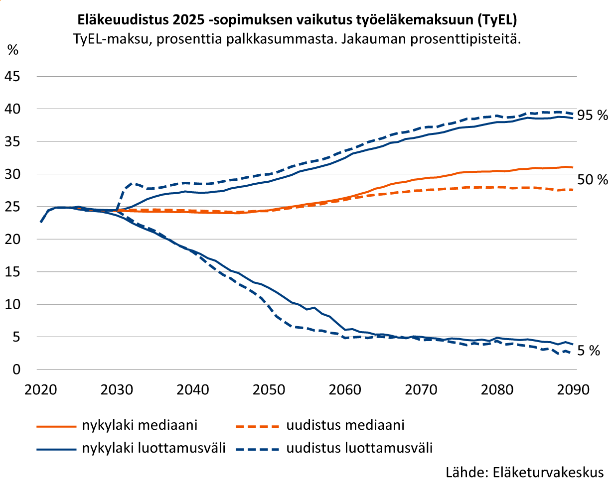 Eläketurvakeskuksen laskelmien mukaan uudistus vahvistaa näillä eri toimilla eläketurvan rahoitusta pitkällä aikavälillä. Uudistuskokonaisuuden vaikutus on keskimäärin noin 1,5 prosenttiyksikköä TyEL-maksua alentava. Vanhuuseläkkeiden rahastointiin tehtävän muutoksen osuus tästä vaikutuksesta on noin viidennes, inflaatiovakauttajan noin neljännes.