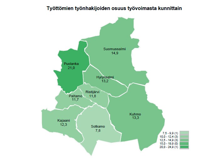 Työttömyysaste oli Kainuussa kuun lopussa 12,2 %, alueista yhdeksänneksi vähiten ja 1,4 prosenttiyksikköä enemmän kuin vuotta aiemmin. Koko maassa työttömyysaste oli 12,0 %, mikä on 0,8 prosenttiyksikköä vuoden takaista enemmän.
