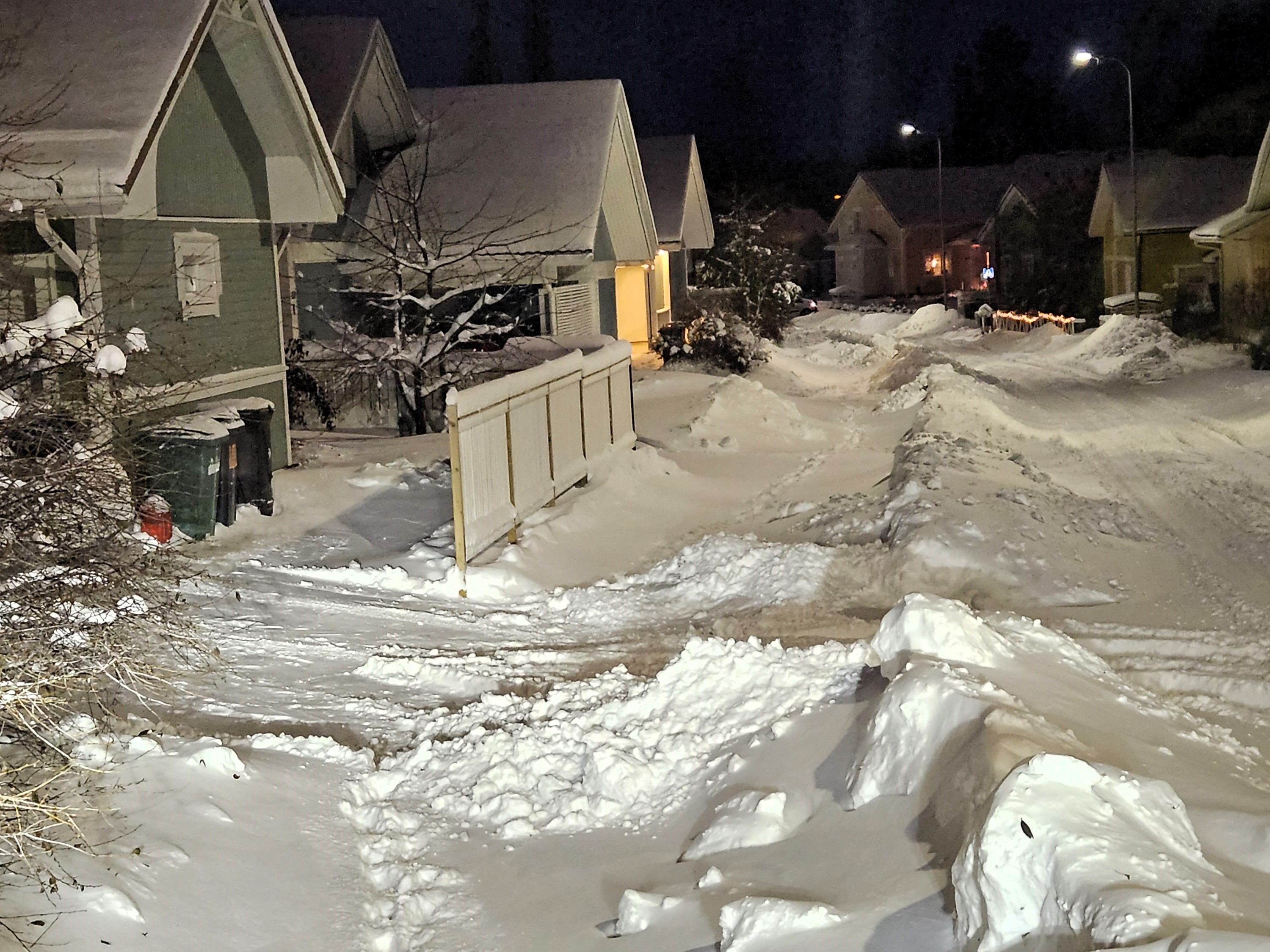 – Snö som hör till fastigheten ska hanteras på fastighetens område. Snö som skottats från trottoaren får inte fösas ut till gata, parkeringsområde eller parker. Om fastigheterna och husbolagen inte tar ansvar så har snöplogarna inte utrymme för snöröjning. Vid stora snömängder så flödar snö över snöstopparen på plogen och det är svårare att öppna tomtanslutningar, berättar underhållsingenjör Mika Ketonen.