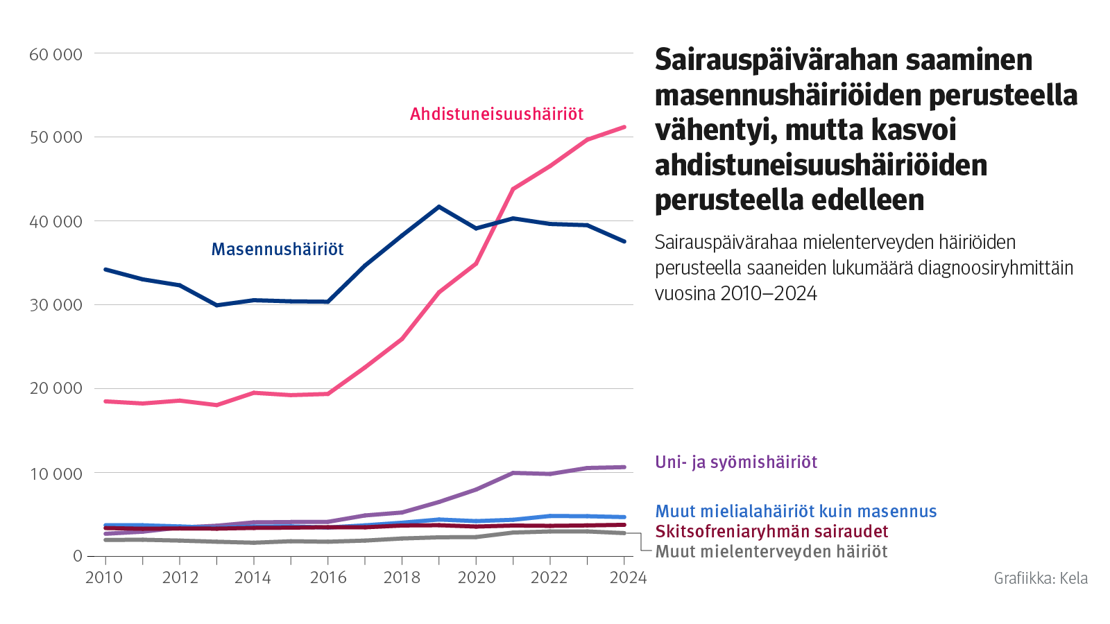 Yli 50 000 henkilöä sai sairauspäivärahaa ahdistuneisuushäiriöiden perusteella vuonna 2024. Edellisvuoteen verrattuna kasvu oli erityisen suurta 35–49-vuotiaiden ikäryhmässä. Masennushäiriöiden perusteella sairauspäivärahaa sai vajaa 38 000 ja unihäiriöiden perusteella vajaa 11 000 henkilöä.