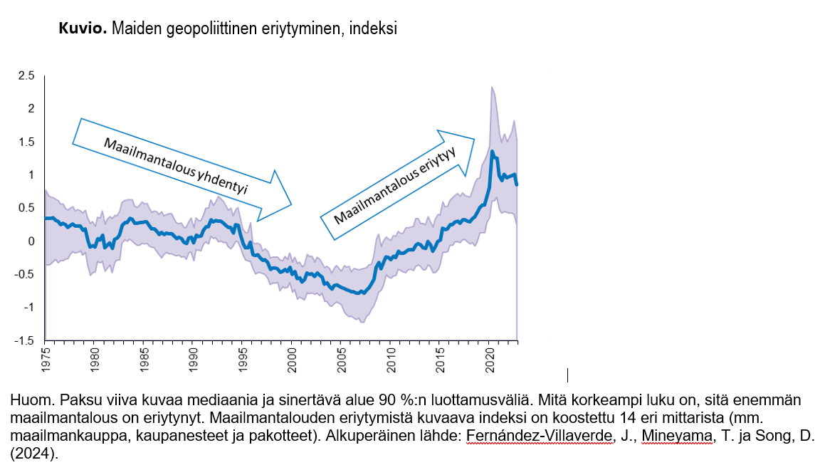 Geopoliittiset jännitteet ovat nousseet keskusteluun etenkin viime vuosina, vaikka maailmantalouden pitkä yhdentymiskehitys muuttui eriytymiseksi jo heti finanssikriisin jälkeen (ks. kuvio). Eriytymiskehitykseen liittyvät esimerkiksi kaupan esteet, pakotteet ja pääomaliikkeiden rajoitukset.