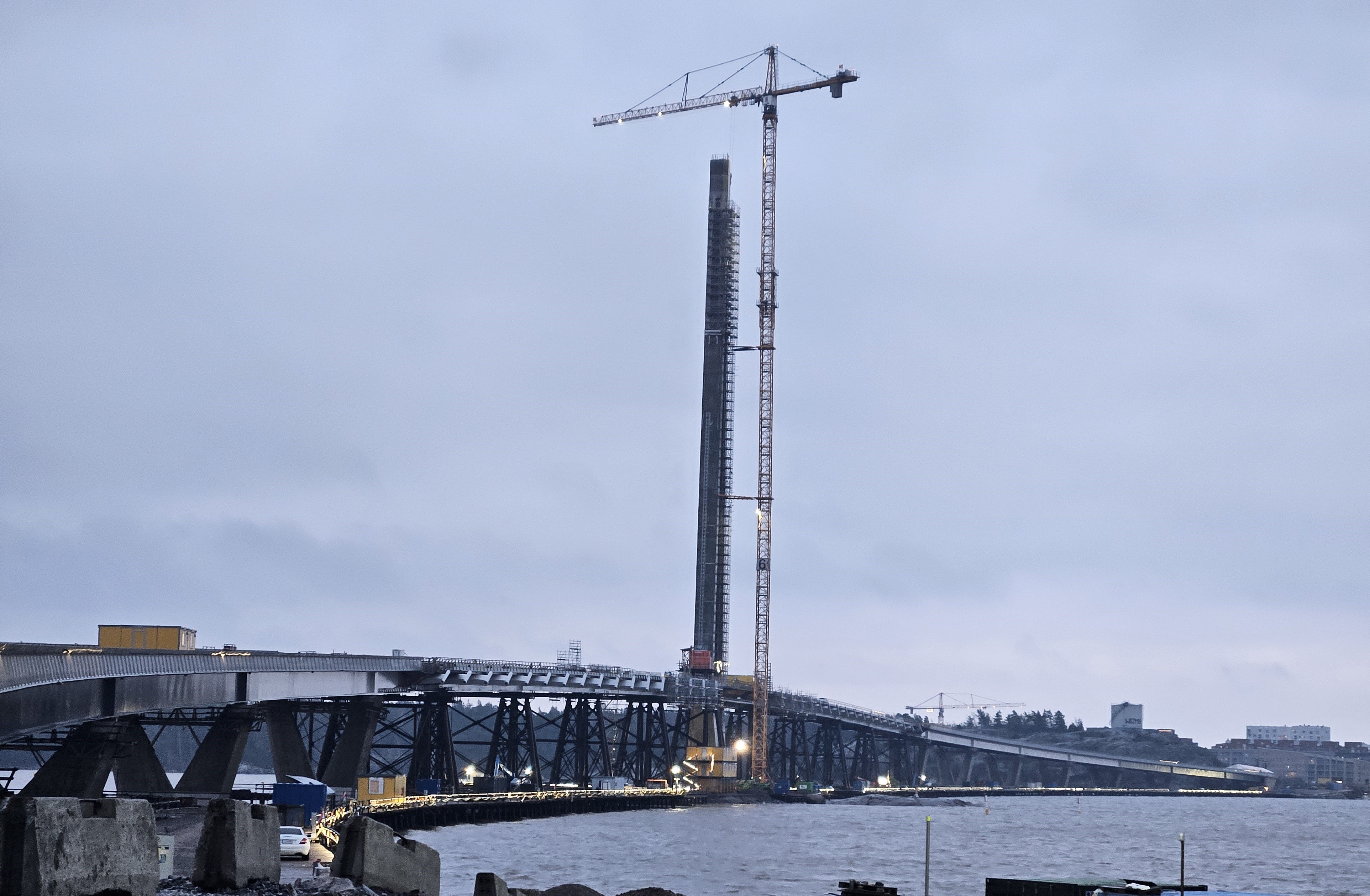 Helsingin Kruunuvuorenselällä sijaitsevan Suomen pisimmän sillan, Kruunuvuorensillan, kannatinpylväs eli pyloni on saavuttanut 135 metrin lakikorkeutensa.