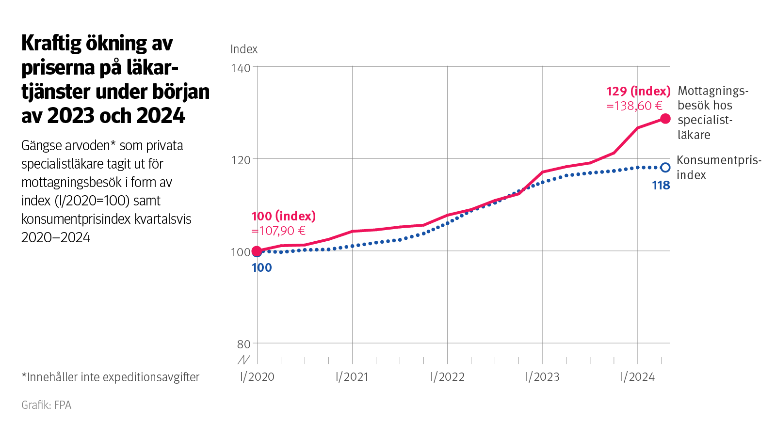 Priserna för besök hos privatläkare steg i början av 2024 med i genomsnitt 8 procent, medan konsumentprisindex under samma period steg med endast 3,3 procent. Konsumentprisindex är ett mått på den genomsnittliga inflationen. De största prishöjningarna gällde psykiatriska tjänster.