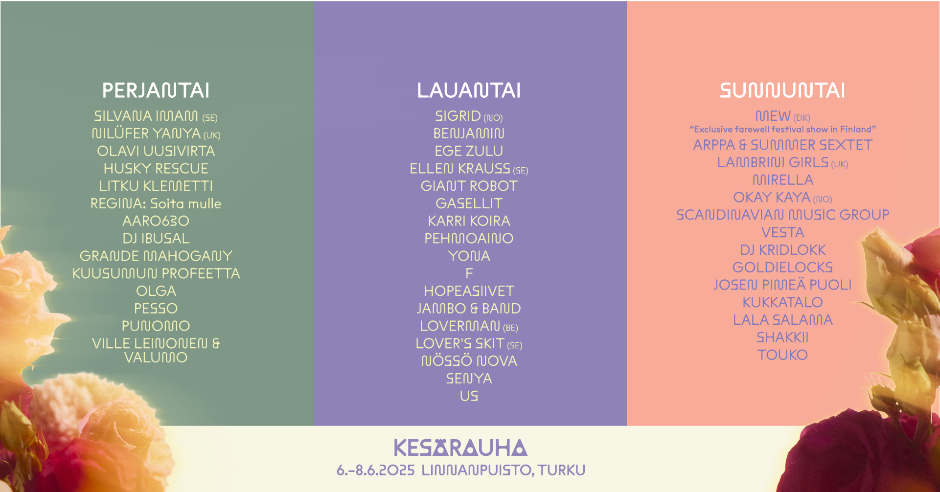 Mew (DK) “Exclusive Farewell Festival Show in Finland”, Sigrid (NO), Nilüfer Yanya (UK), Silvana Imam (SE), Olavi Uusivirta, Arppa & Summer Sextet, Benjamin, Ege Zulu, Ellen Krauss (SE), Gasellit, Giant Robot, Husky Rescue, Karri Koira, Lambrini Girls (UK), Mirella, Okay Kaya (NO), Pehmoaino, Regina: Soita mulle, Litku Klemetti, Scandinavian Music Group, Vesta, Yona, Aaro630, DJ Ibusal, DJ Kridlokk, F, Goldielocks, Grande Mahogany, Hopeasiivet, Jambo & Band, Josen Pimeä Puoli, Kukkatalo, Kuusumun Profeetta, Lala Salama, Loverman (BE), Lover’s Skit (SE), Nössö Nova, Olga, Pesso, Punomo, Senya, Shakkii, Touko, US, Ville Leinonen & Valumo + lisäyksiä luvassa