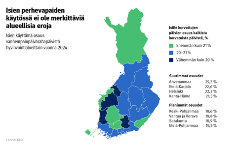 Alueellisesti erot isien perhevapaiden käytössä eivät ole suuria. Tilastoissa Ahvenanmaa erottuu Manner-Suomesta siten, että siellä isät käyttivät vuonna 2024 jo yli neljänneksen kaikista korvatuista päivistä.