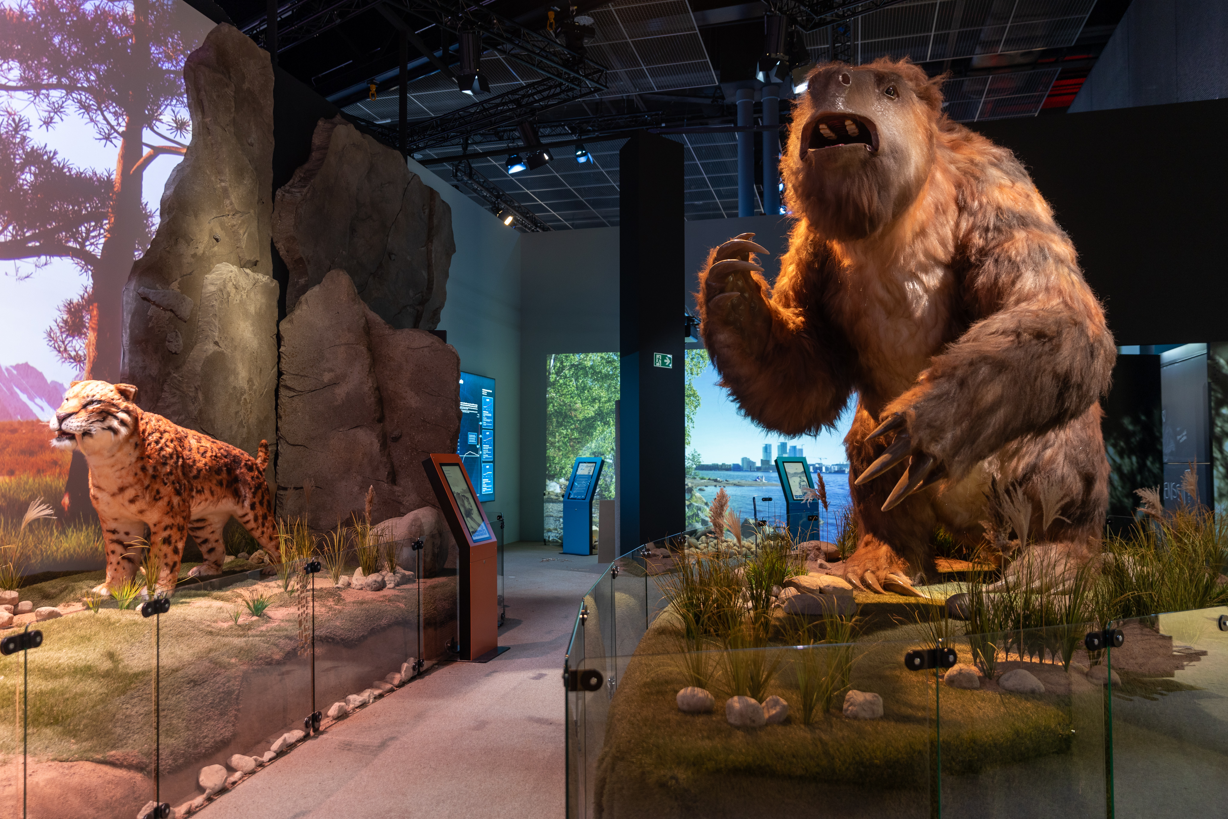 Näyttelyssä Länsi-Euroopan mammuttiaroa esittelevällä alueella on villamammutin lisäksi esillä villasarvikuono, jääkarhu ja luolaleijona. Kalifornian punapuumetsään on sijoitettuna tylppäkuonokarhu, mastodontti ja hirmukoira. Argentiinan pampan maisemissa on puolestaan tutkittavana sen alueen eläinerikoisuuksia, kuten jättiläislaiskiainen, hippidion, toksodontti ja hurja sapelihammaskissa.