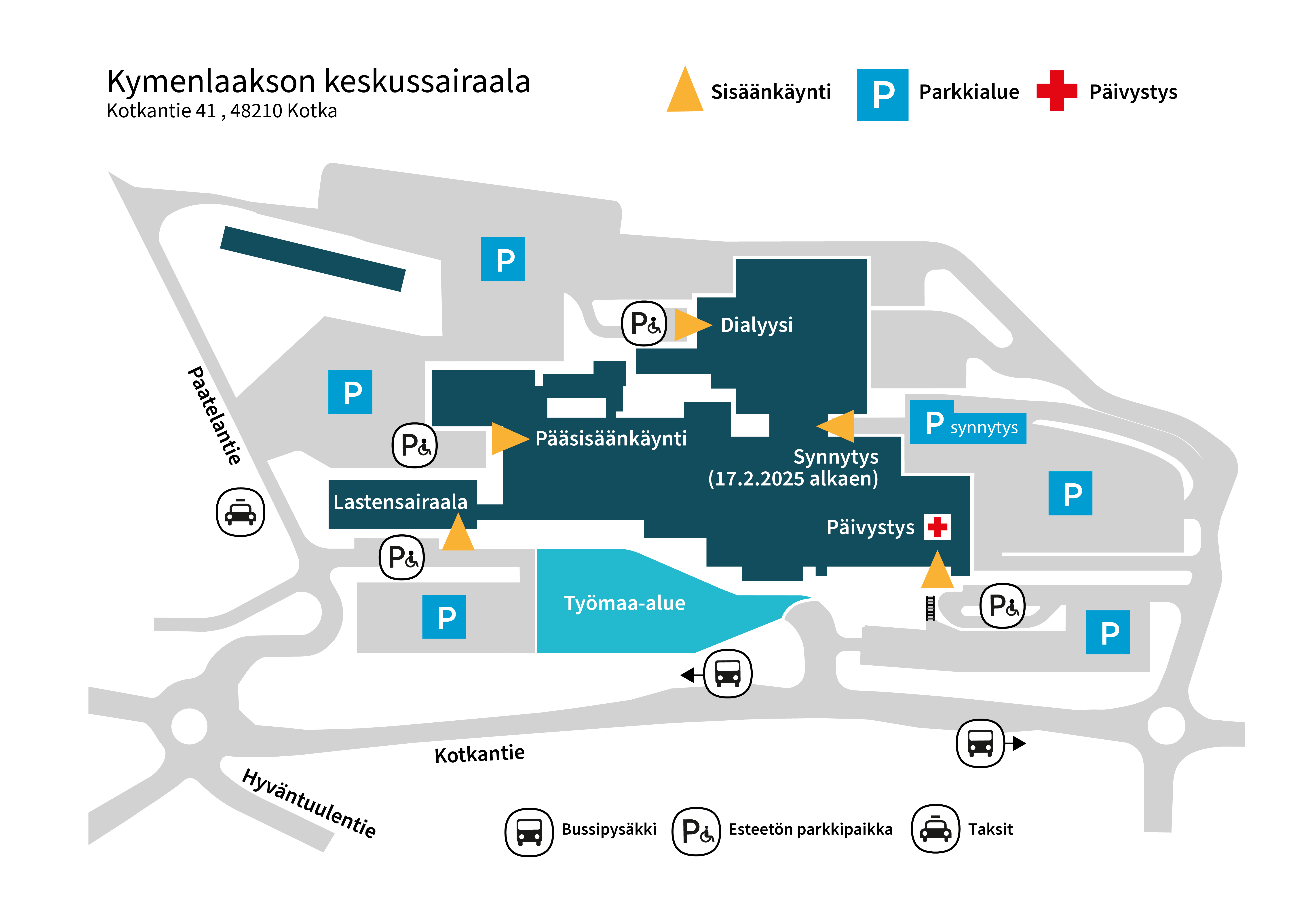 Synnyttäjien sisäänkäynti sijaitsee 17.2.2025 kello 8 alkaen Kymenlaakson keskussairaalan (Kotkantie 41, 48210 Kotka) pohjoispäädyssä F-sairaalaosan yhteydessä. Sairaalan pohjoispäätyyn kuljetaan Kotkantien kautta. Sisäänkäynnin läheisyyteen on varattu synnytykseen tulijoille aikarajattomia parkkipaikkoja.