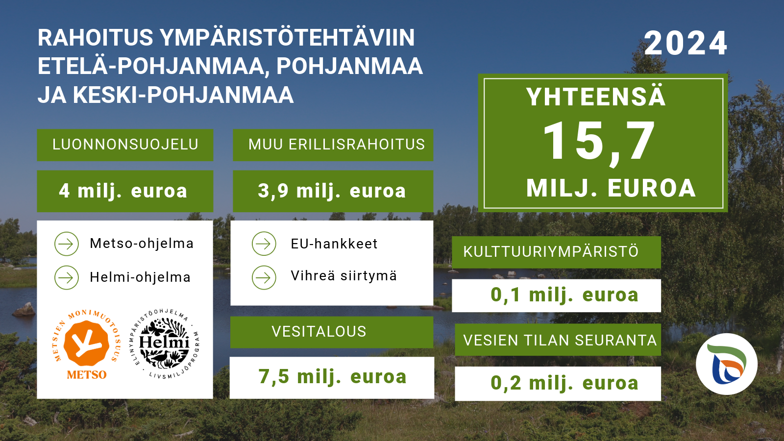 Suojeluohjelmia toteutettiin pohjalaismaakunnissa yhteensä 1183 hehtaaria lähes 2,4 miljoonalla eurolla. Tästä kokonaissuummasta vapaaehtoisten ohjelmien (METSO ja HELMI) osuus oli 690 000 euroa. Lisäksi HELMI-rahoituksella on inventoitu, suunniteltu ja kunnostettu runsaasti muun muassa perinnebiotooppeja, pienvesiä, lintuvesiä ja rantaluontoa 1,2 miljoonalla eurolla. Arvokkaaksi lintuvedeksi luokiteltua Alavuden Kuivasjärven Pikkuselkää kunnostettiin JTF-rahoituksella 350 000 eurolla. Rauhoitettujen harvinaisten eläinten aiheuttamien vahinkojen korvauksiin käytettiin 319 000 euroa.