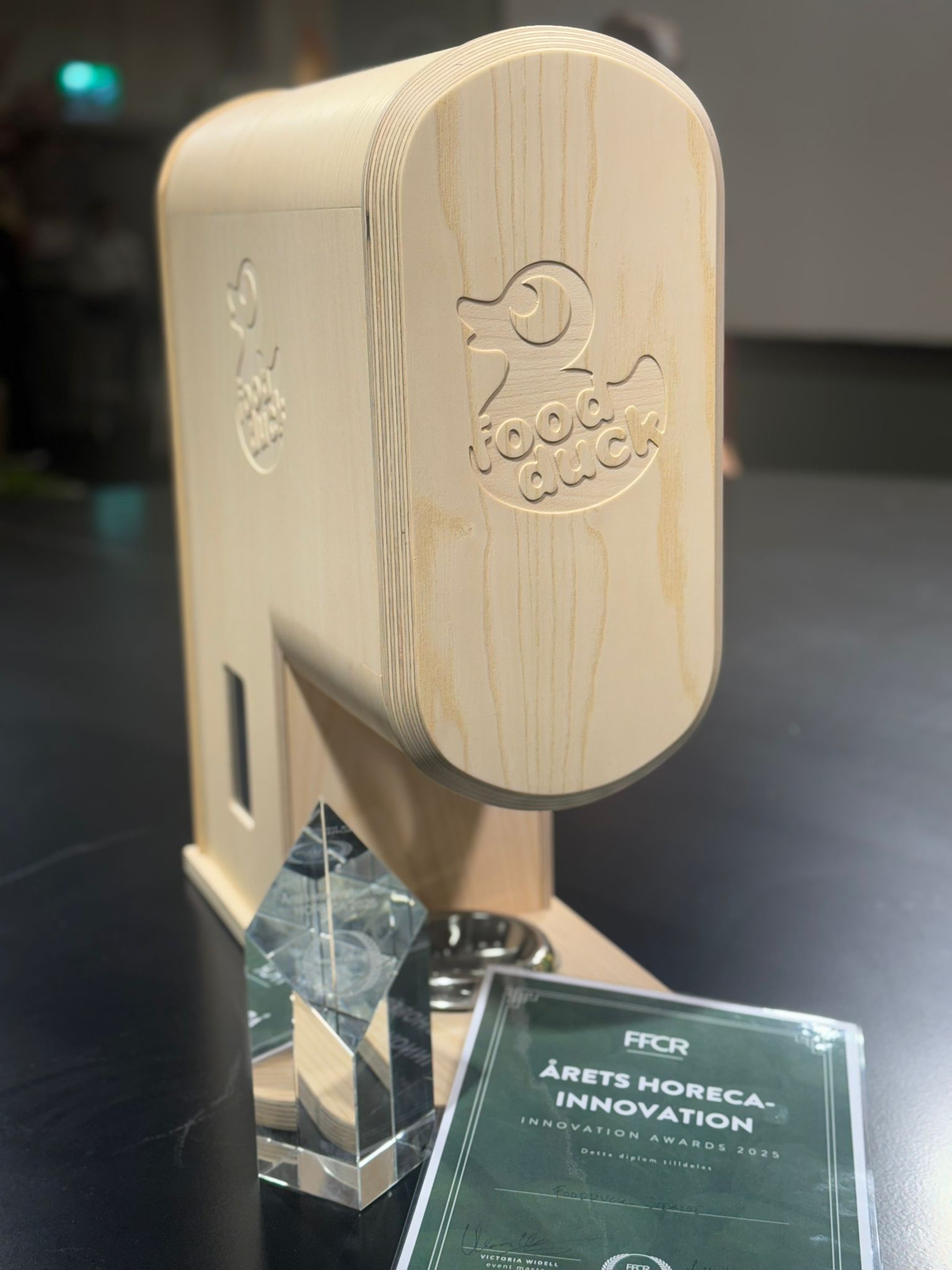 FOODDUCK-leviteannostelija on ainoa laatuaan maailmassa. Visiomme mukaan laite on tulevaisuudessa niin ravintolalle kuin ruokailijoille merkki vastuullisesta ja ekologisesta leipäpöydästä. Se helpottaa arkea sekä tarjoaa uusia elämyksiä leipäpöytiin ja linjastoihin. Leviteannostelija vähentää merkittävästi muovijätettä ja hävikkiä sekä parantaa asiakaskokemusta – ja nyt se on myös virallisesti palkittu vuoden 2025 HoReCa-innovaationa. FFCR Innovation Awards -palkinto jaettiin 30.1.2025 Tukholmassa.