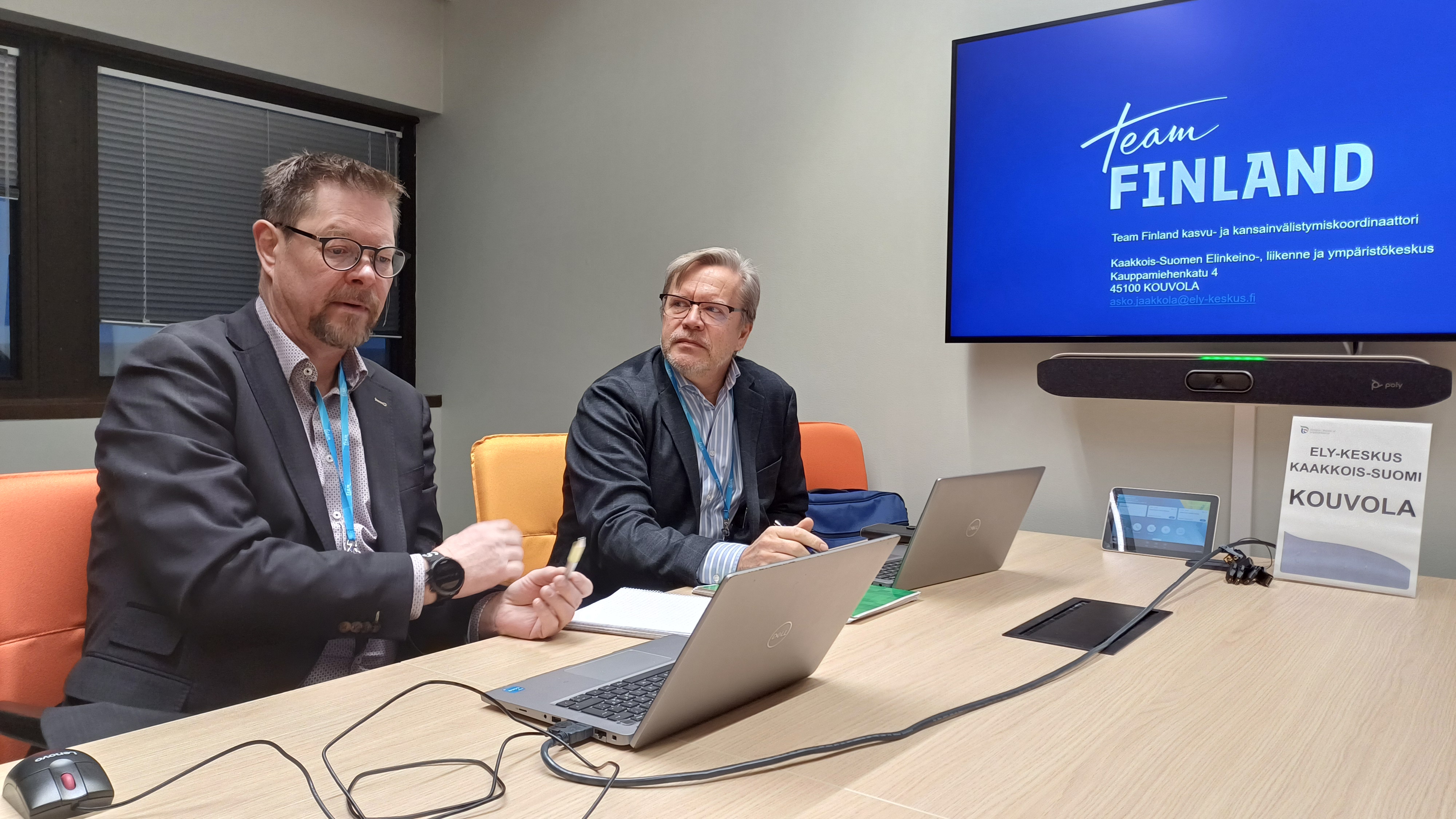 Kaksi miestä neuvotteluhuoneessa tietokoneiden ääressä. Heidän takanaan on näyttö, jossa lukee "Team Finland".