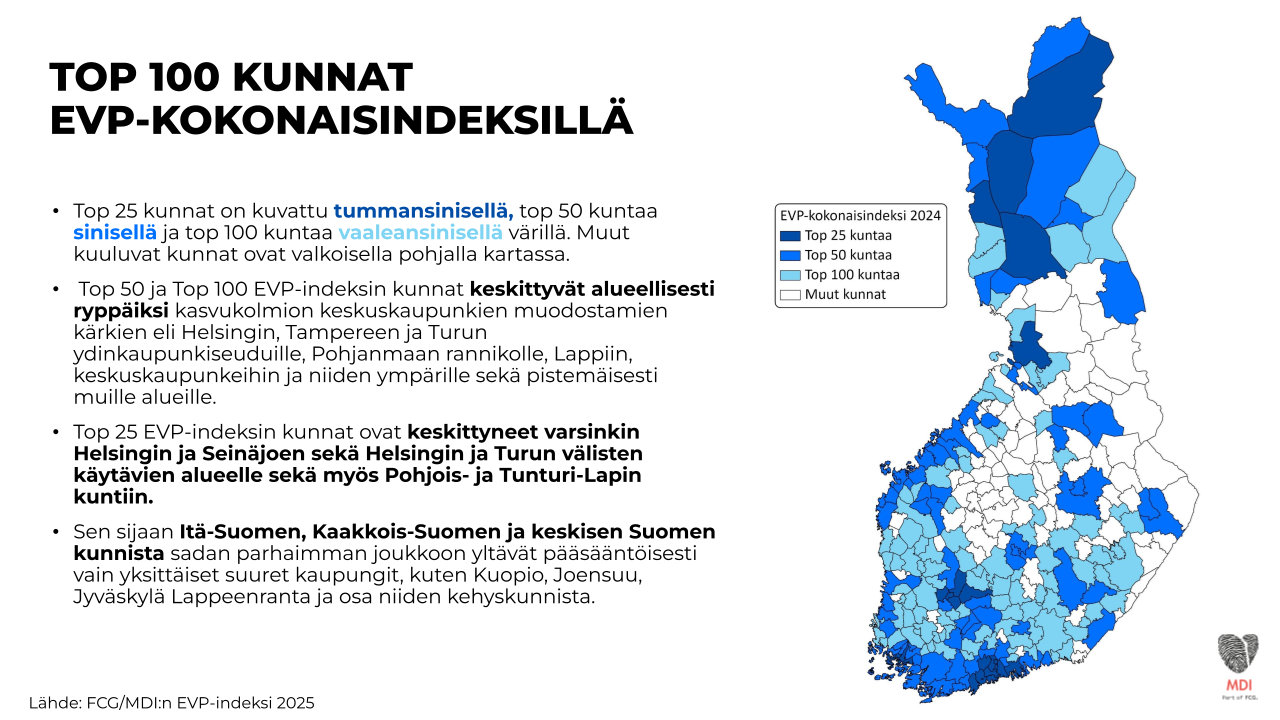 FCG Finnish Consulting Group ja sen osana toimiva MDI julkaisivat joulukuussa vuonna 2023 Elinvoima, vetovoima ja pitovoima -indeksin. Nyt indeksi ja sen taustalla olevat tilastot on päivitetty. Päivitetyssä indeksissä on tarkasteltu entistä laajemmin kuntien elinvoimaa, vetovoimaa ja pitovoima ja niiden edellytyksiä. Kokonaisindeksissä suuret kaupungit ja niiden kehyskunnat saavuttivat jälleen korkeimmat sijoitukset, mutta myös yllättäjiä löytyy, etenkin Lapista.