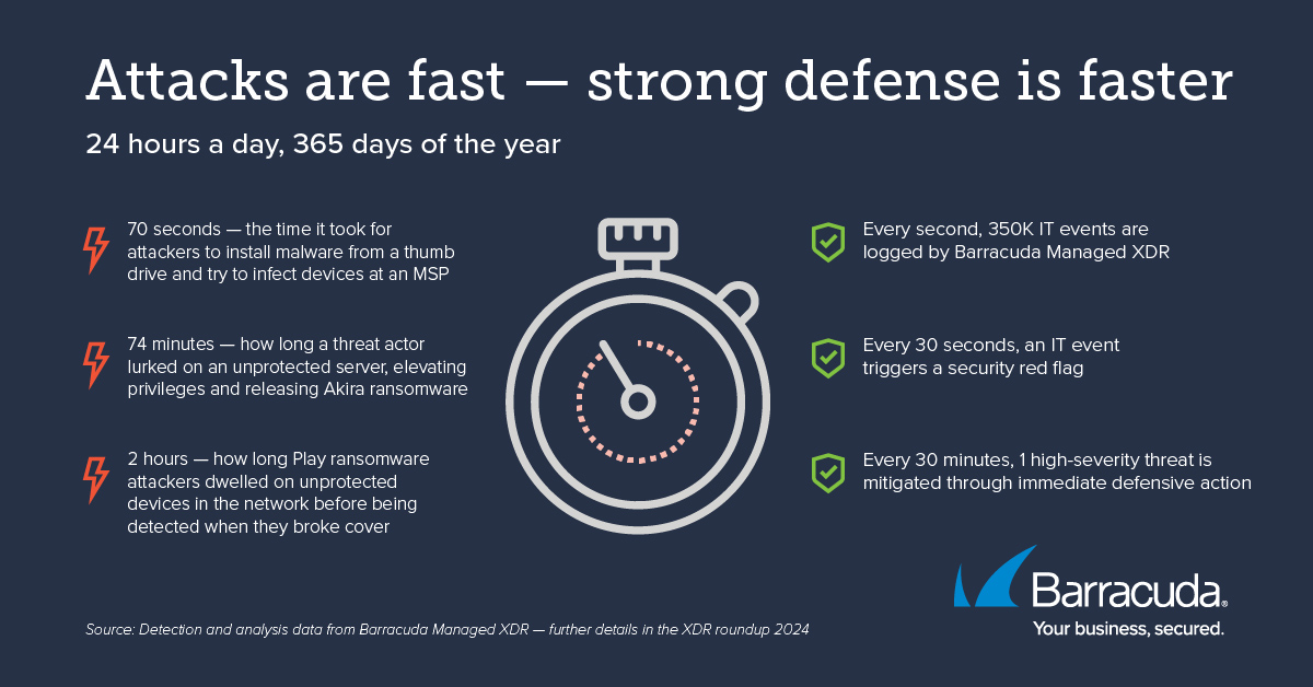 Data osoittaa myös hyökkäysten nopeuden vuonna 2024. Tietoturvatyökalujen ja -strategioiden kehittyminen tarkoittaa, että tunkeilijat havaitaan aiempaa helpommin ja nopeammin sekä myös poistetaan verkosta nopeasti. Murtautujat ovat vastanneet tähän kiihdyttämällä hyökkäyksiään. Barracuda Managed XDR:n havaintodata ja esimerkit vuoden 2024 vaaratilanteista kertovat, miten näitä kahta asiaa voitaisiin lähestyä.