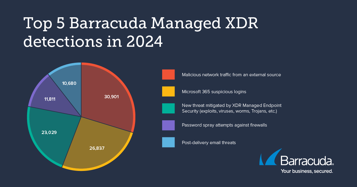 Vuonna 2024 Barracuda Managed XDR kirjasi 11 biljoonaa it-tapahtumaa – noin 350 000 tapahtumaa sekunnissa – ja tunnisti miljoona potentiaalista riskiä ja tuhansia tapauksia, jotka edellyttivät välittömiä puolustustoimia. Barracudan Security Operations Centerin uhka-analyytikot ovat käyttäneet tätä dataa osoittaakseen yleisimmät tavat, joilla hyökkääjät yrittivät murtautua kohteisiin ympäri maailmaa vuonna 2024.