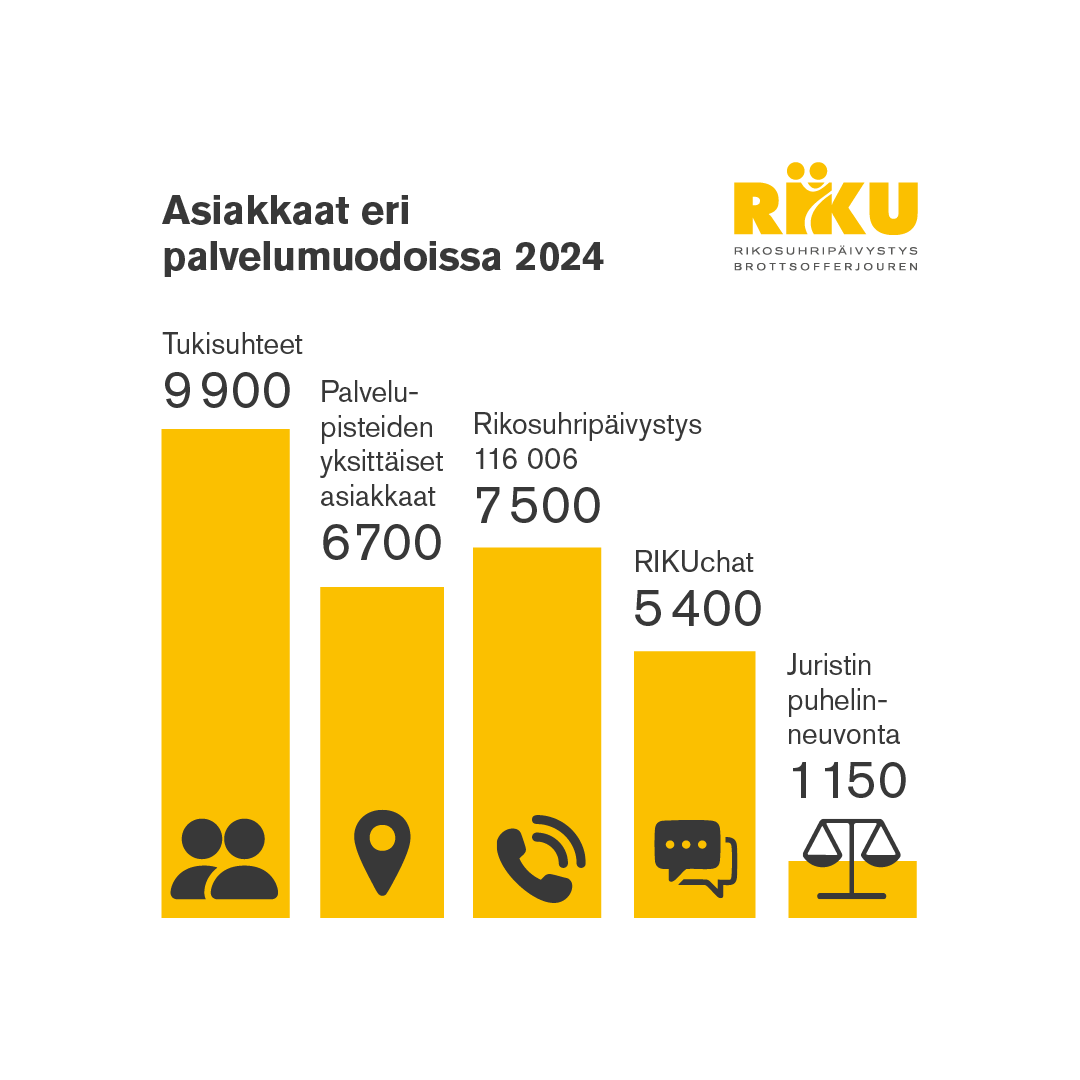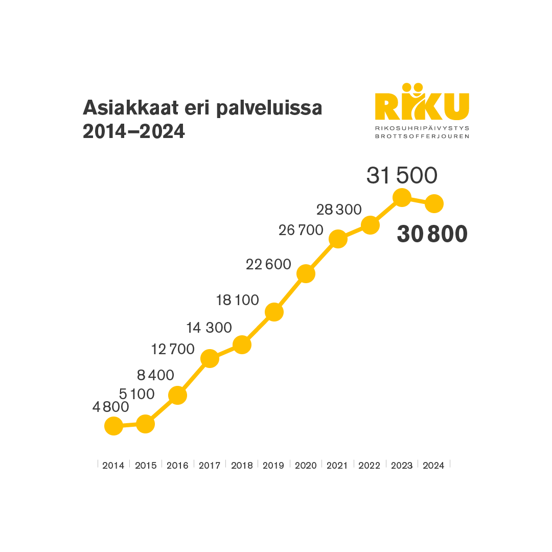 Lähisuhdeväkivalta ja seksuaalirikokset ovat yleisimmät syyt hakea apua Rikosuhripäivystyksestä (RIKU). Viime vuonna RIKUn eri palveluissa oli yhteensä 30 800 asiakasta, joista 6 700 haki tukea lähisuhdeväkivallan ja 4 700 seksuaalirikosten takia.
