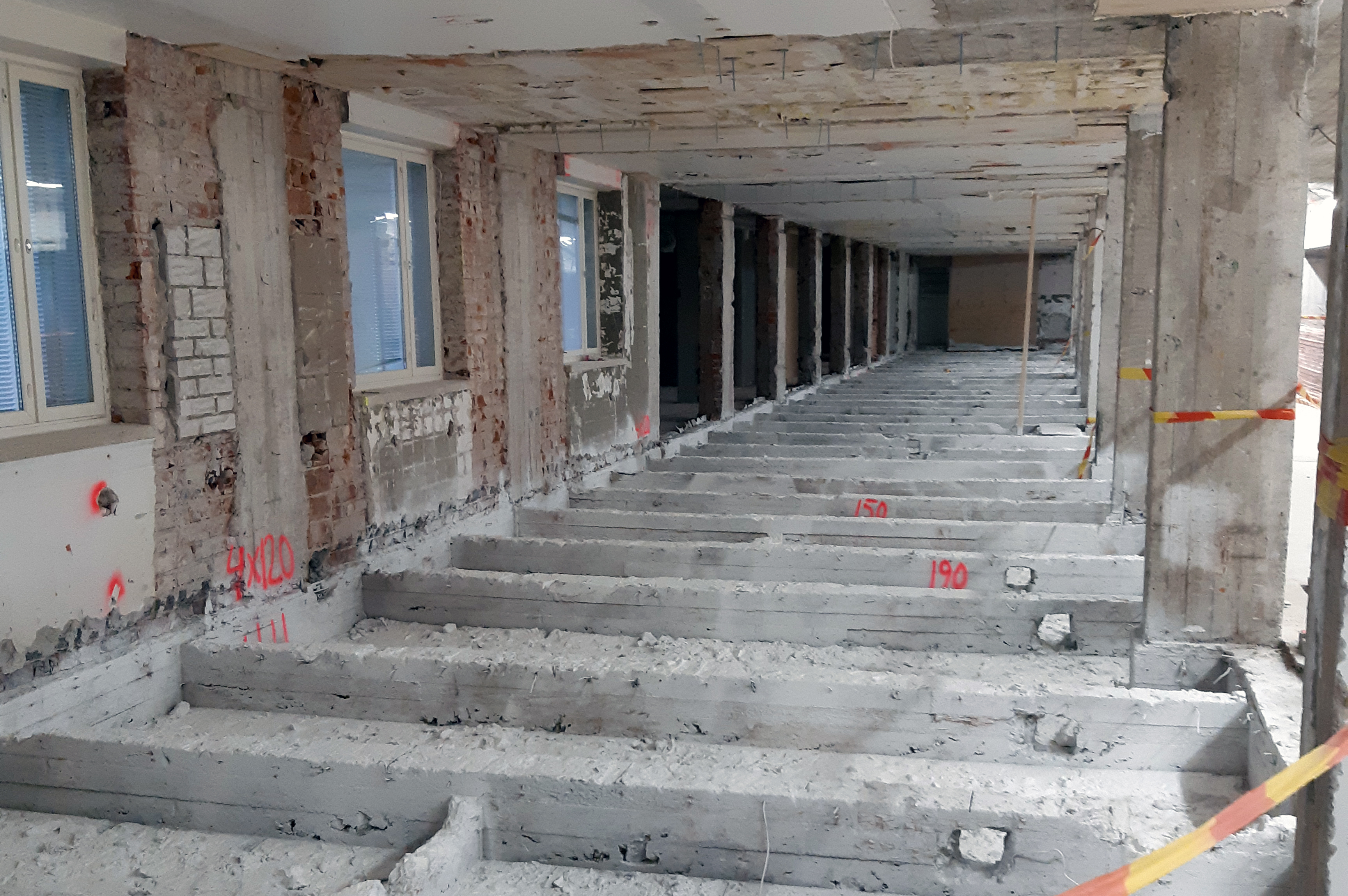 Rakennuksesta purettiin mm. kaikki osastojen sisäiset seinät, välipohjatäytöt, pintalattia, alakattorakenteet sekä tekniikka.