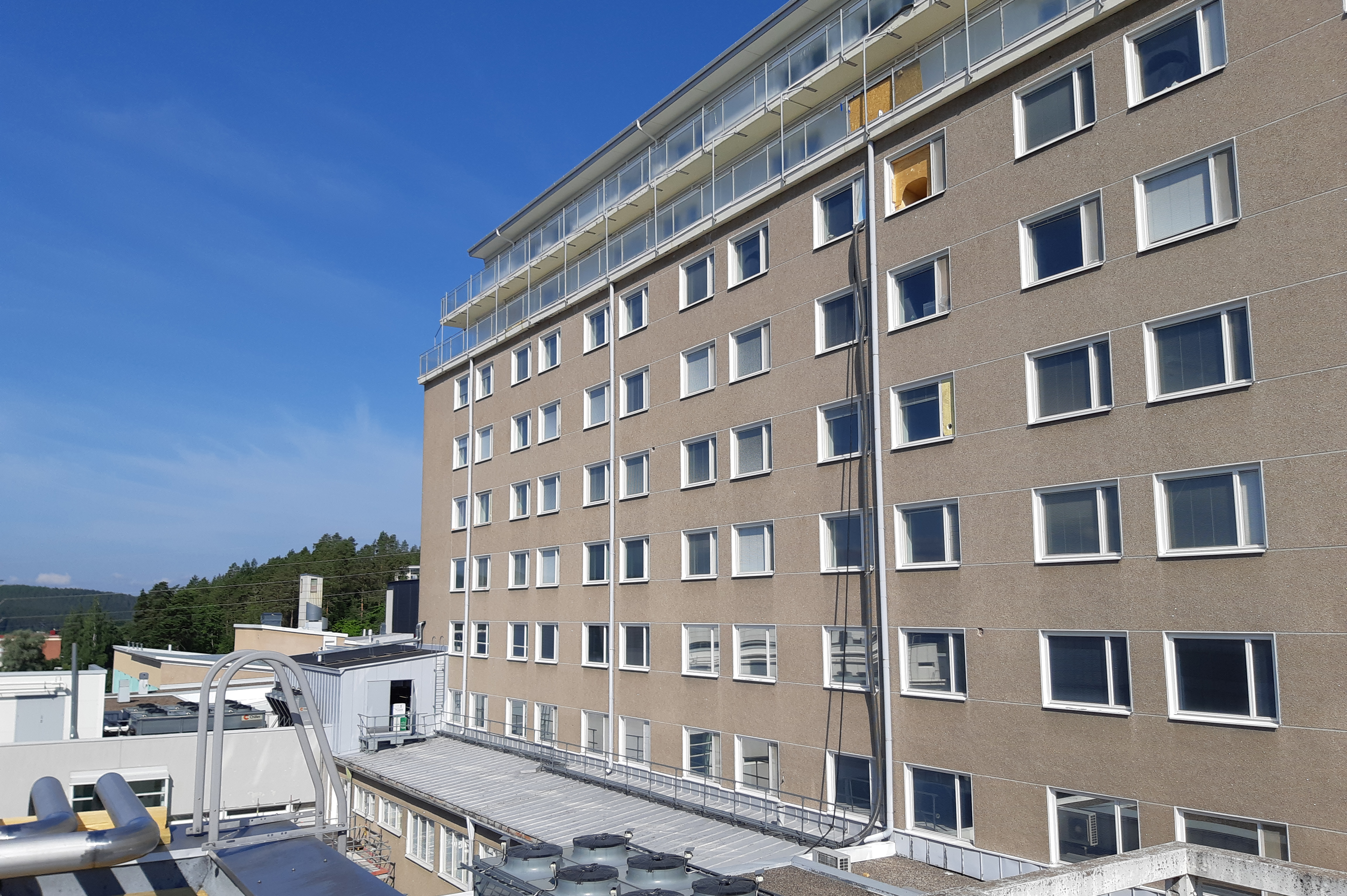 – Vanha vuodeosastorakennus on rakennusperintölailla suojeltu ja tästä syystä julkisivuun kohdistuvat toimenpiteet ovat olleet varsin huomaamattomia, jotta rakennuksen arkkitehtoninen, historiallisesti arvokas ja kaupunkikuvan kannalta merkittävä luonne säilyy. Esimerkiksi ikkunajakoa ei ole muutettu ja vanhojen parvekkeiden siluetit on säilytetty, kertoo rakennuttajapäällikkö Reino Pyy hyvinvointialueen kiinteistöhallinnosta.