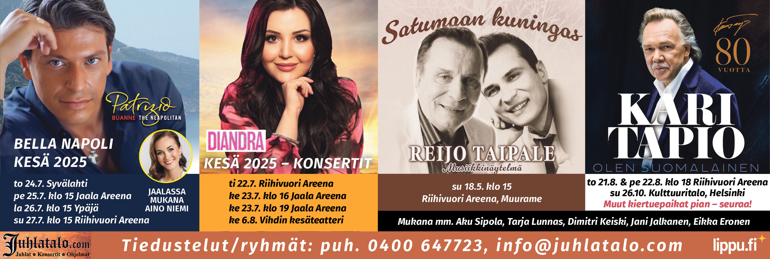 Patrizio Buanne kommer äntligen till Finland från sina världsturnéer för att uppträda på utsålda konserter den 6–9 februari 2025, efter ett uppehåll på 18 år! Konserterna kommer att hållas i Helsingfors, Åbo och Jyväskylä och det utlovas italienska och internationella musikklassiker. Med i showen är också den mycket populära Diandra. Efter dessa ser vi fram emot en underhållande sommar med Patrizio i Finland 2025.