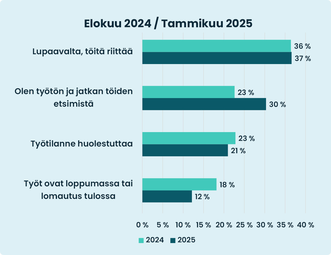Kyselyyn vastanneiden suhtautuminen työmarkkinoihin on pysynyt lähes ennallaan. Tammikuussa 37 prosenttia vastaajista koki, että töitä riittää, mikä on lähes sama kuin elokuussa 2024 (36 %). Toisaalta tämä tarkoittaa myös sitä, että valtaosa vastaajista (63 %) näkee työtilanteensa epävarmana tai haastavana. Työmarkkinoiden kehitys herättää siis sekä optimismia että huolta riippuen vastaajien tilanteesta.