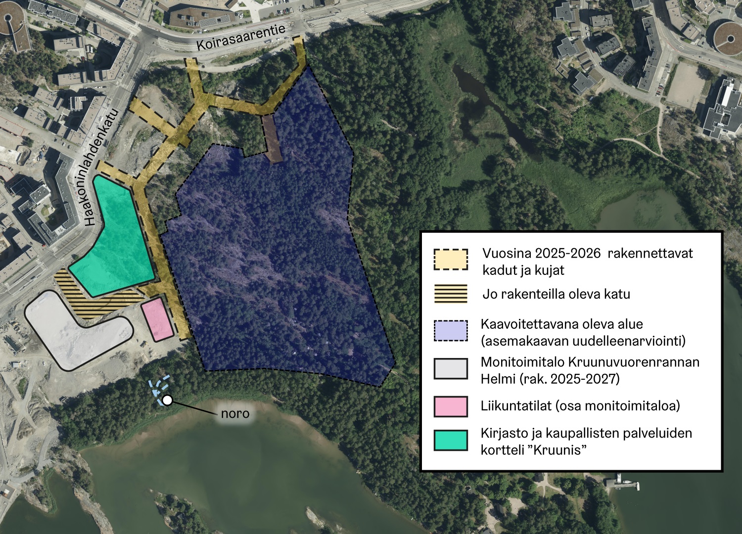 Ilmakuva, johon on merkitty rakennettavat kadut, palvelukorttelit ja noron sijainti.