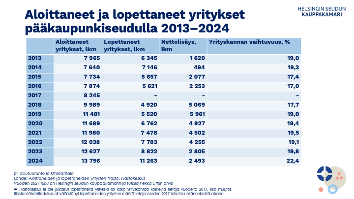 Raportin Yrityskannan vaihtuvuudesta ja arvion koko vuonna 2024 lopettaneista yrityksistä Helsingin seudun kauppakamarille on tehnyt tutkija Pekka Lith. Myös viime vuonna hän arvioi lopettaneiden yritysten määrän. Vahvistettujen ja tarkentuneiden tilastojen mukaan yrityksiä lopetti 2023 pääkaupunkiseudulla 8 822.