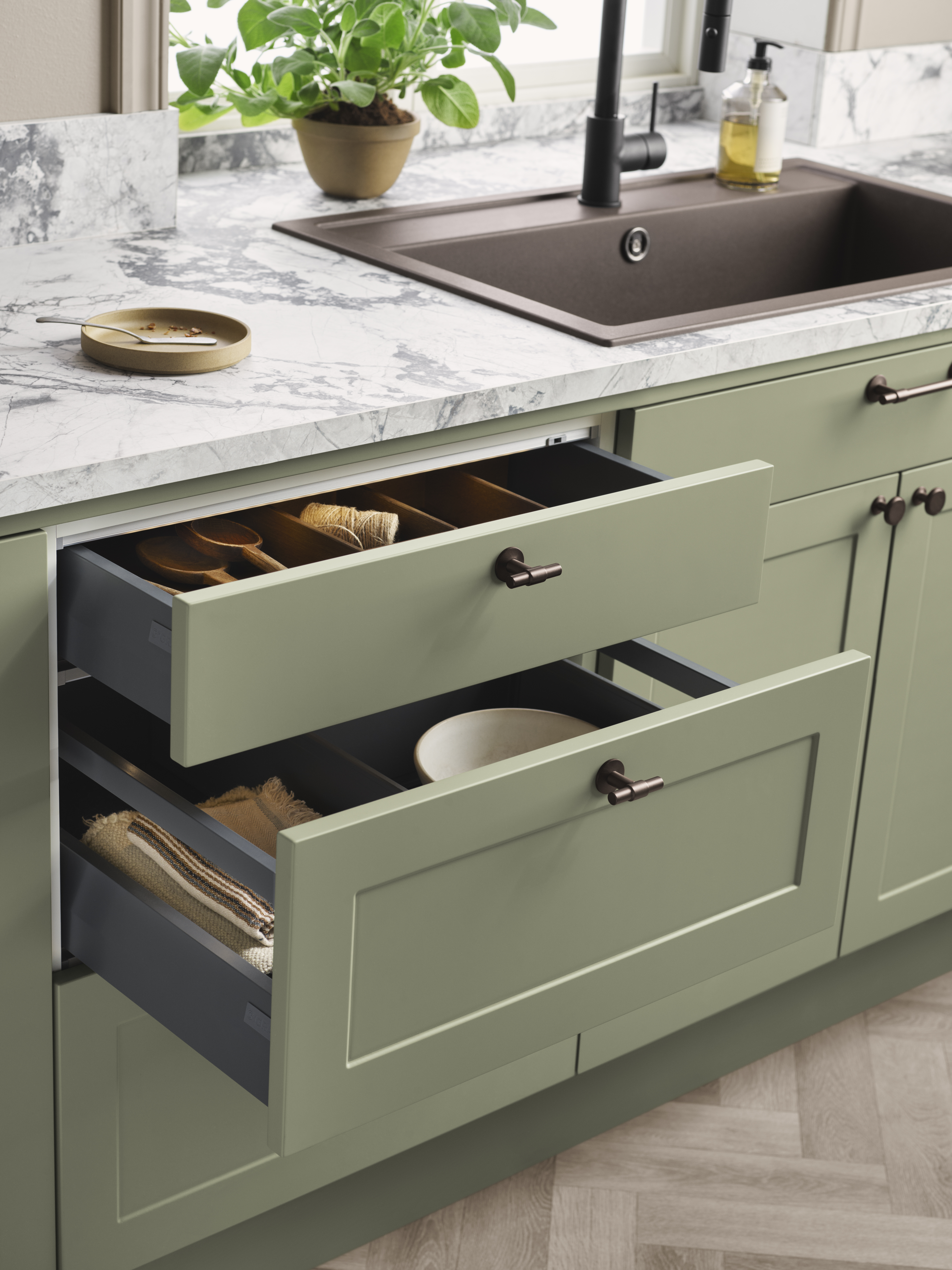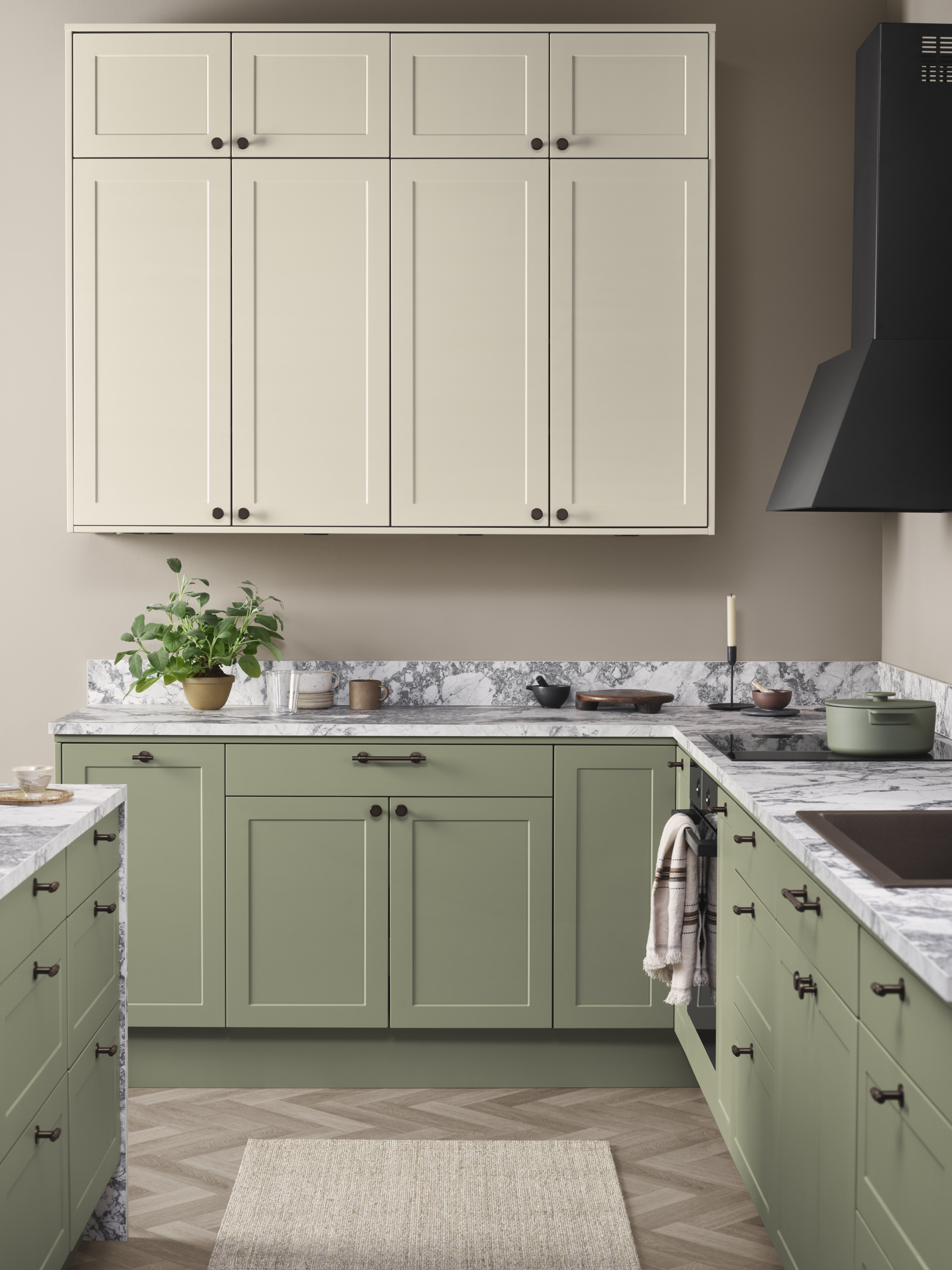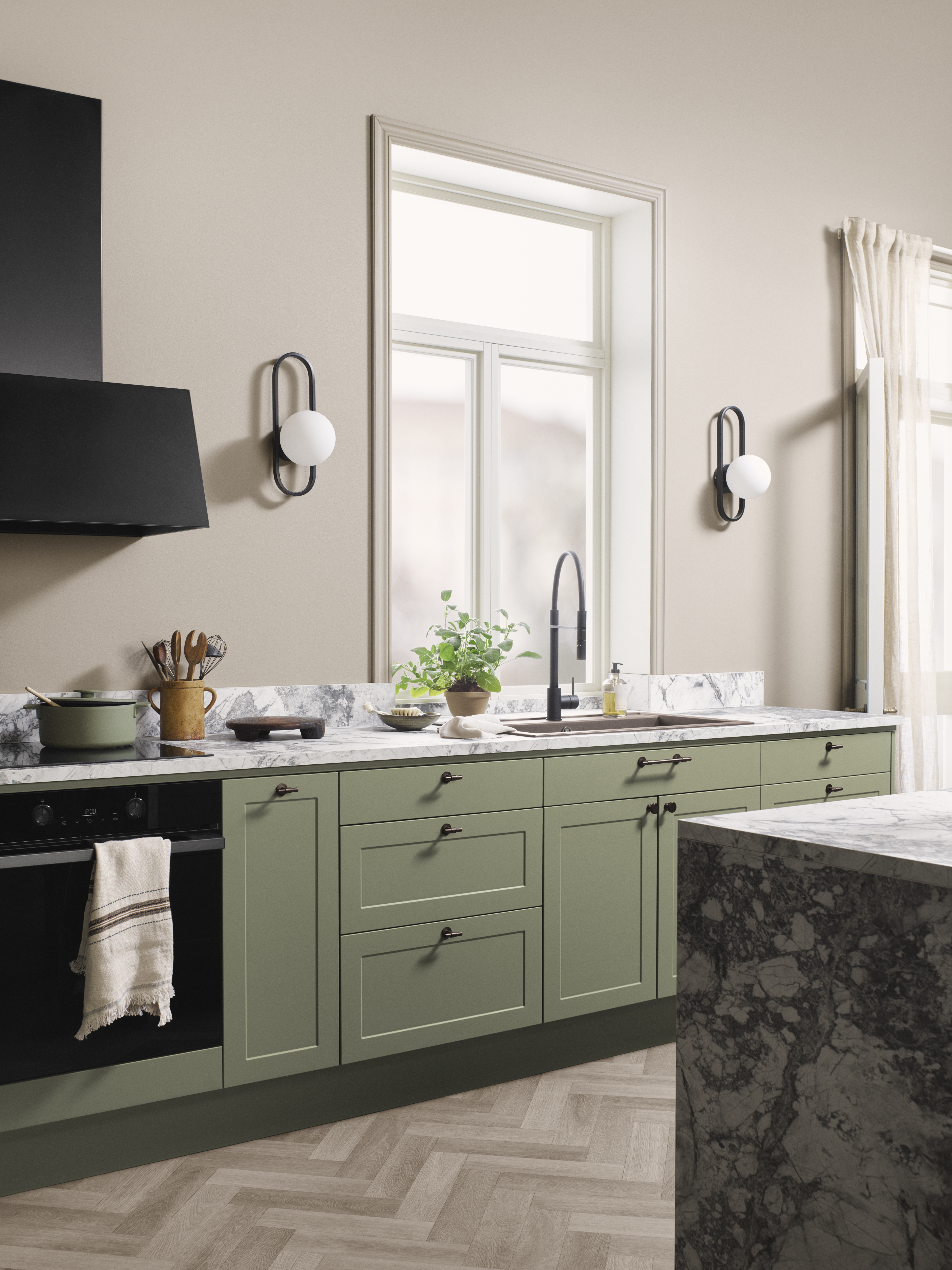 Kevään trendiväri keittiöissä on oliivinvihreä, joka on noussut talven sisustusmessuilla yhdeksi kysytyimmistä sävyistä. Suomalaiskodeissa harmaan ja beigen yhdistelmä greige säilyttää edelleen asemansa, mutta sen rinnalle haetaan nyt lämpimiä vihreän ja ruskean sävyjä.