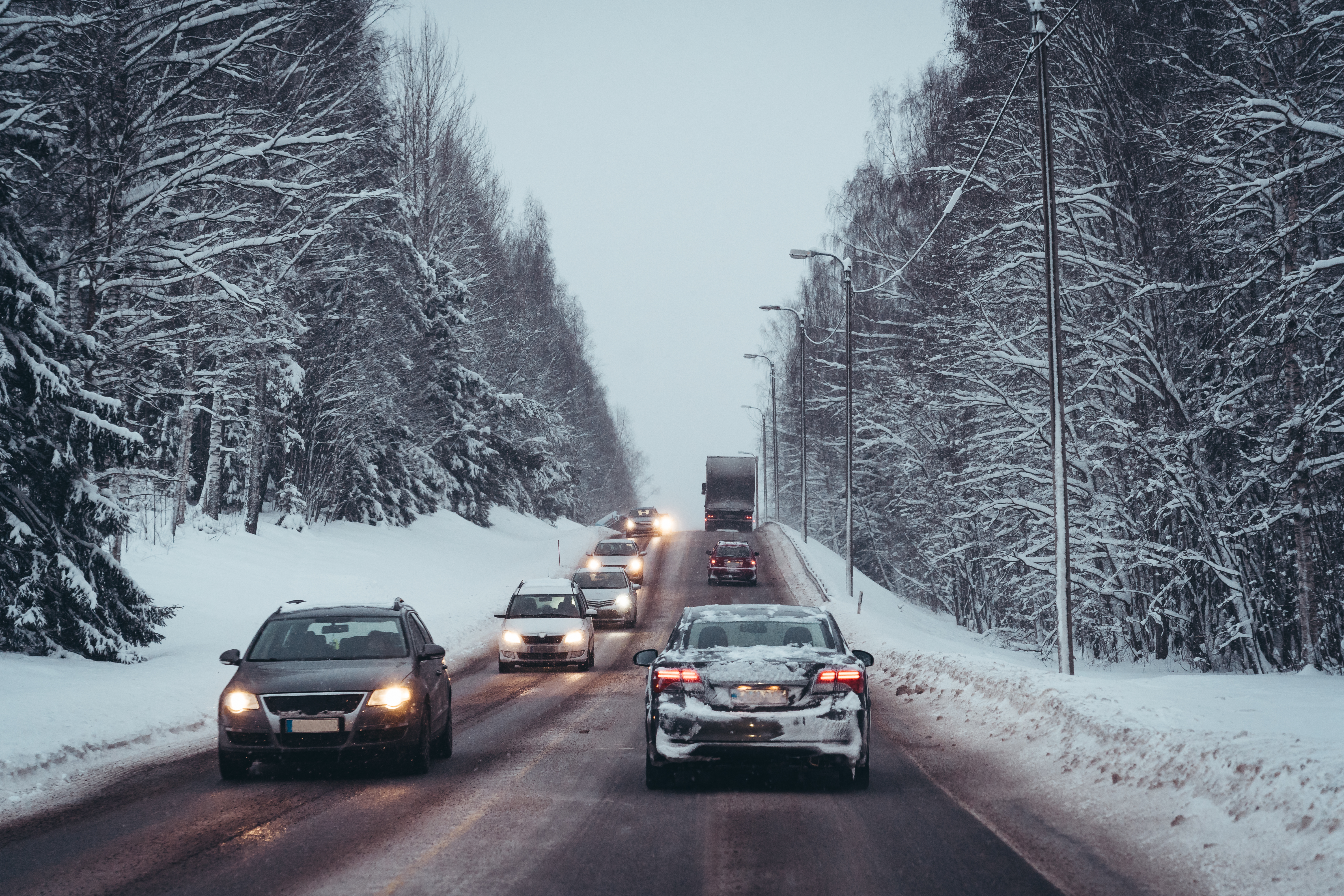 Autoja ajamassa lumisella maantiellä talvisessa maisemassa.