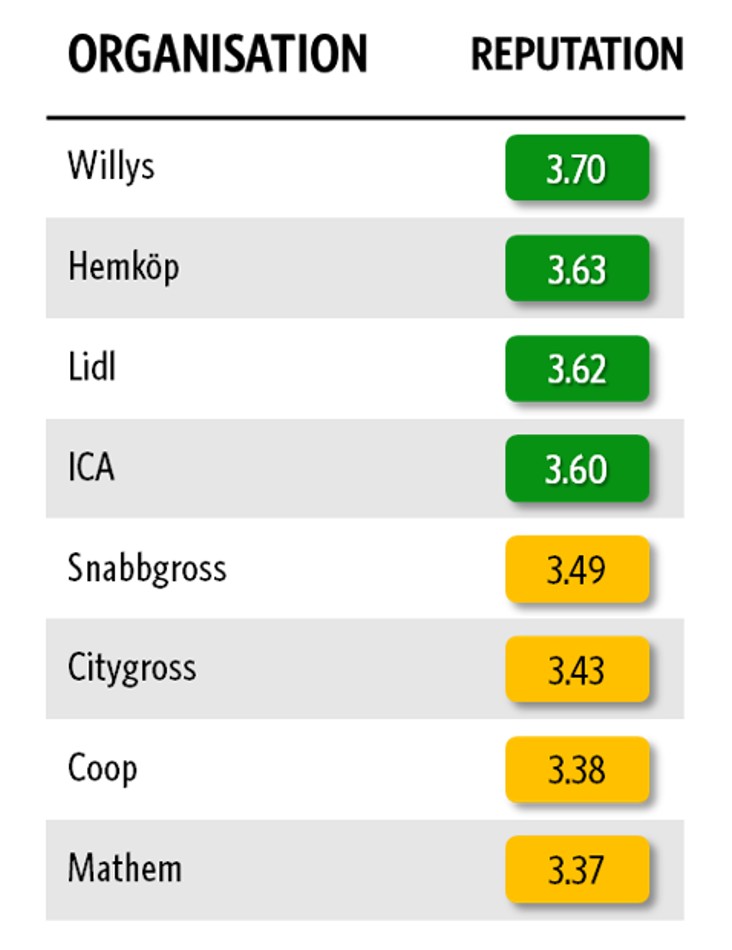 Willys har tagit över förstaplatsen med ett anseende på 3,70, följt av Hemköp (3,63) och Lidl (3,62). Willys starka anseende beror främst på uppfattningar kring prisvärde, ledarskap och kommunikation. Den positiva utvecklingen av anseendet återspeglas även i affärsresultatet: Willys växte med 4,8 procent under fjärde kvartalet 2024 och vilar mot sin starkaste marknadsposition någonsin.