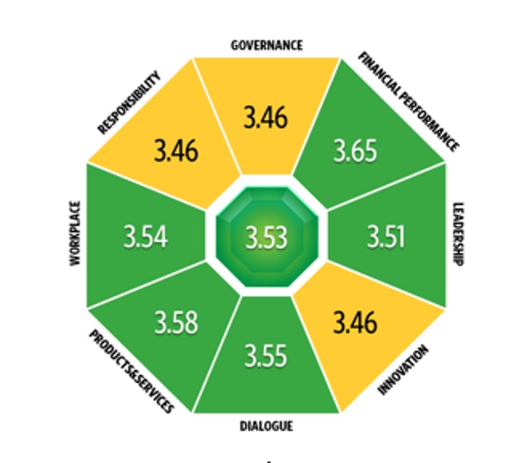 Ett snittvärde på 3,53 på en femgradig skala visar att branschens anseende är gott och anseendets underliggande dimensioner är relativt samlade. Mest positiva är allmänhetens upplevelser kring Financial Performance, Products and Services, Dialogue respektive Workplace.