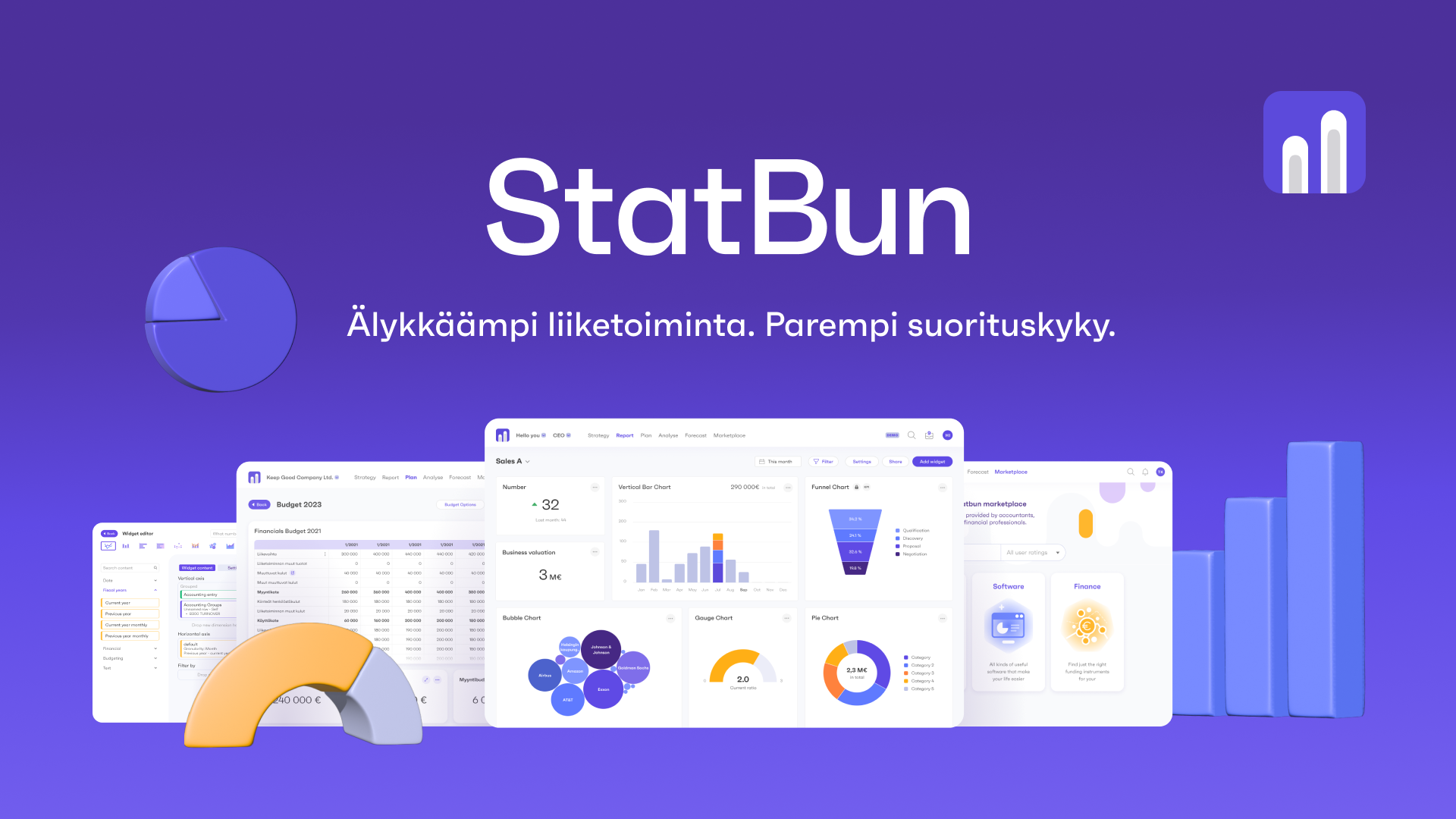 Liiketoimintatiedon hallinnan (BI) ohjelmistot ovat perinteisesti olleet arvokkaita, monimutkaisia ja vaativat raskaita käyttöönotto- ja jatkoprojekteja. Suomalainen innovaatio StatBun liiketoiminta-alusta tuo liiketoimintatiedon hallintaan uudenlaisen lähestymistavan. Heti käyttövalmis alusta tuo yrityksille ja sen sidosryhmille modernit työkalut liiketoiminnan älykkäämpään johtamiseen ja sidosryhmäyhteistyöhön – ilman perinteisiin ratkaisuihin liittyviä rasitteita tai rajoitteita.