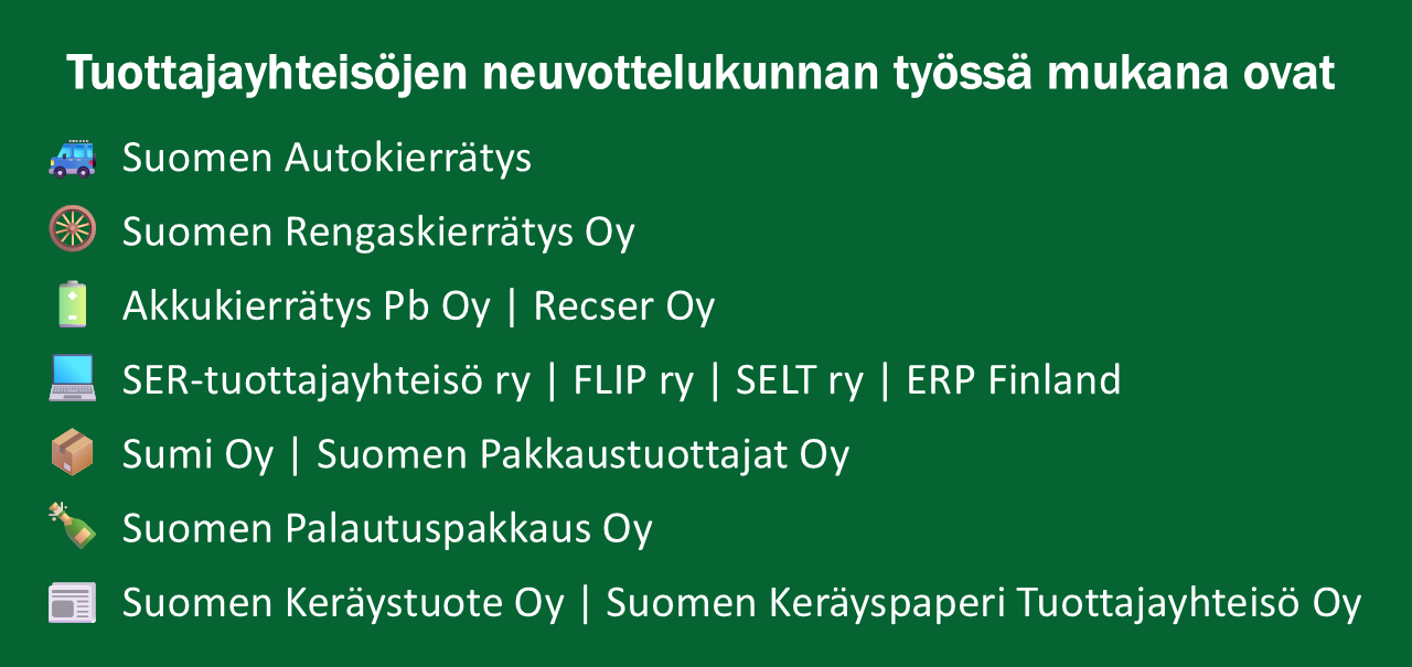 Tuottajavastuulliset yritykset vastaavat itse markkinoille laskemiensa tuotteiden ja pakkausten talteenotosta, kierrätyksestä ja muusta hyötykäytöstä. Tuottajavastuujärjestelmät käsittelevät vuosittain 1,2 miljoonaa tonnia materiaalia tukemaan Suomen kiertotaloutta. Tuottajavastuun alaisia tuotteita ovat ajoneuvot, renkaat, sähkölaitteet, pakkaukset, paperi, tietyt kertakäyttöiset muovituotteet (SUP), muovia sisältävät kalastusvälineet sekä akut ja paristot.