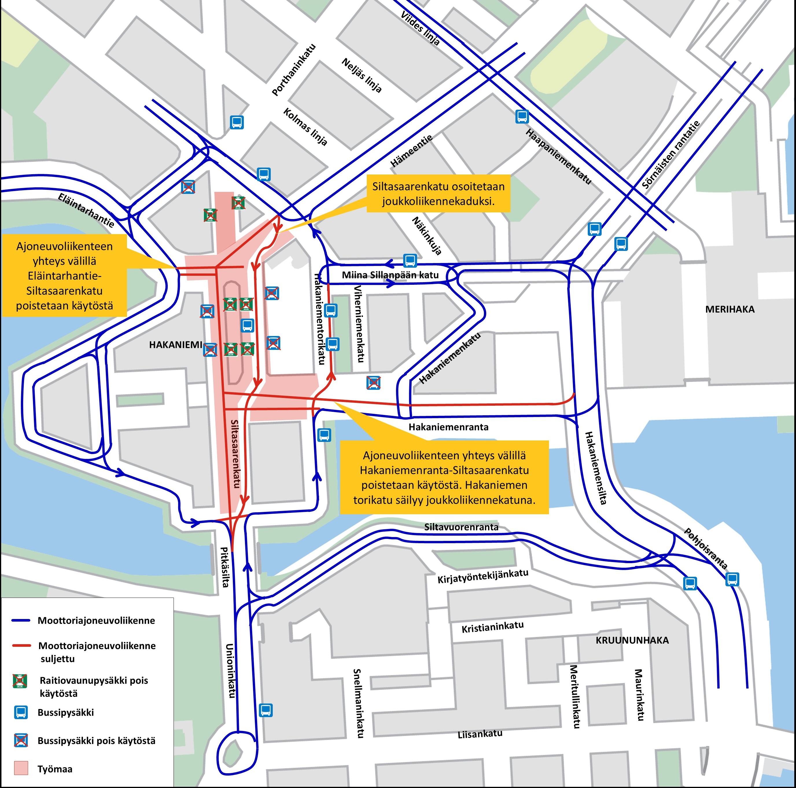 Katso tarkat tiedot joukkoliikenteen muutoksista: https://www.hsl.fi/hsl/uutiset/liikennetiedote/2025/01/hakaniemen-ratikka--ja-bussireitit-muuttuvat-3.-maaliskuuta--ratikkaliikenne-pitkansillan-yli-katkeaa-marraskuuhun-asti