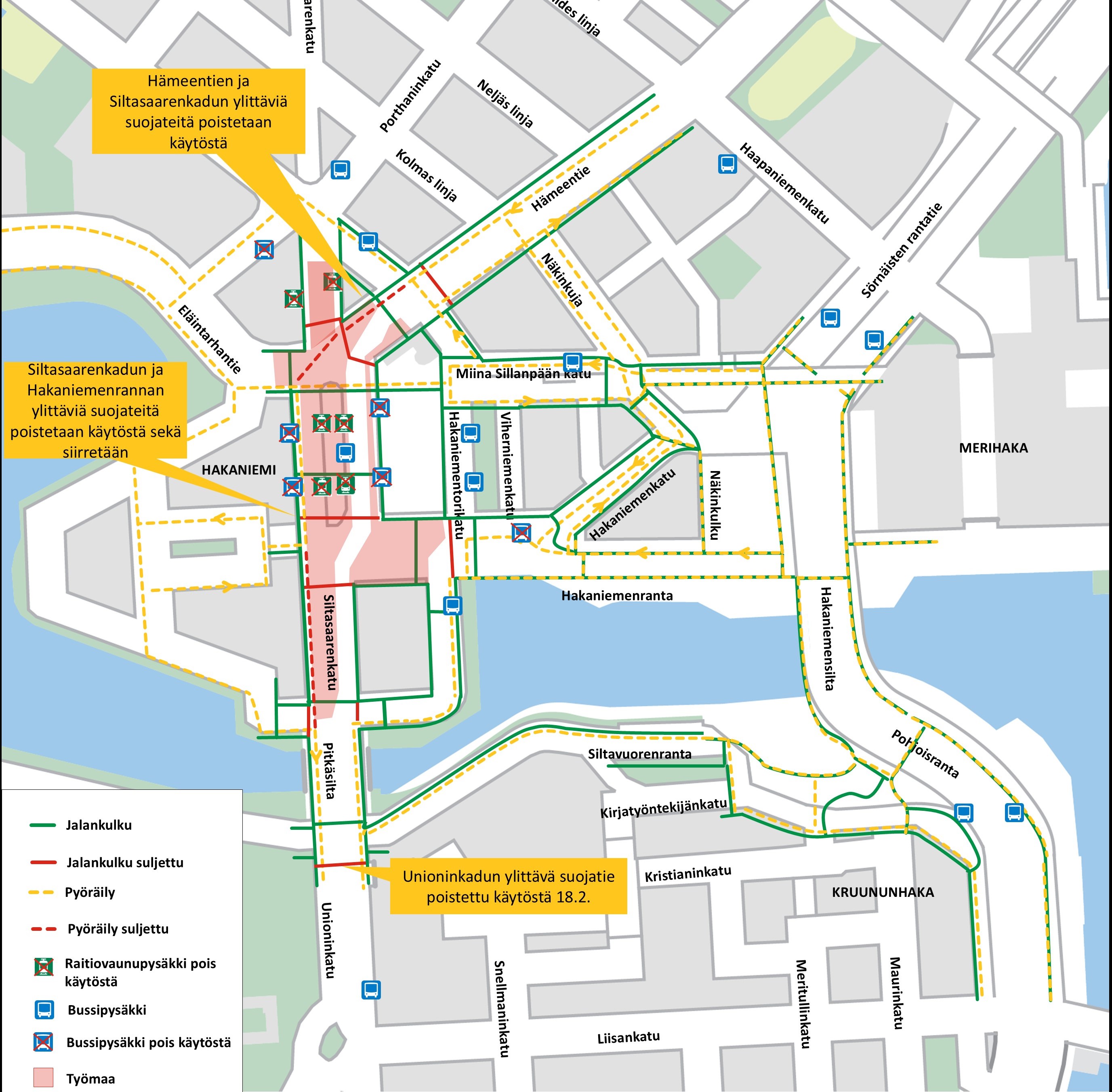 Osa Hämeentien, Siltasaarenkadun ja Hakaniemenrannan ylittävistä suojateistä siirtyy tai poistuu käytöstä (ks. oheinen kartta).