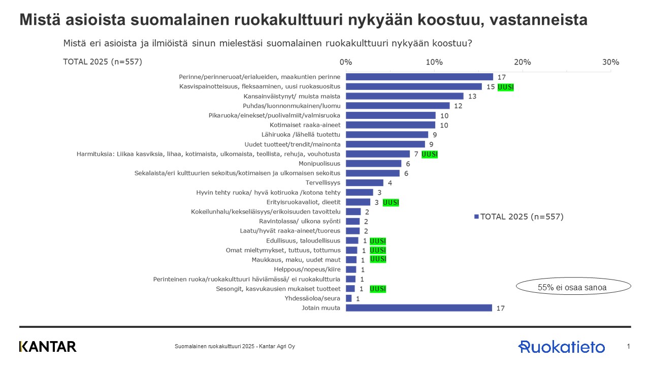 - Erityisen mukava on huomata se, että suomalaisuus on hiipinyt ruokakulttuuriin ilmiönä. Tämä kertonee siitä, että suomalaiset ovat alkaneet nähdä oman maan ruokakulttuurin olemassaolon aiempaa selkeämmin, toteaa Ruokatieto Yhdistyksen kehityspäällikkö Minna Asunmaa.