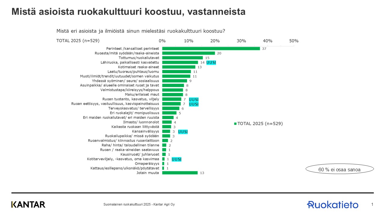 Ruokakulttuuriin yleisenä ilmiönä sisältyy suomalaisten mielissä erityisesti perinteet, erilaiset raaka-aineet sekä tavat ja tottumukset. Vastauksissa mainitaan usein myös raaka-aineiden paikallisuus tai kotimaisuus, ruoan sosiaaliset ja kulttuuriset ulottuvuudet sekä valmistustavat ja ruokalajit. Uutta sisältöä ruokakulttuuri-sanalle on tullut ennen kaikkea paikallisuudesta, ylipäätään tuotannosta sekä eettisyydestä.